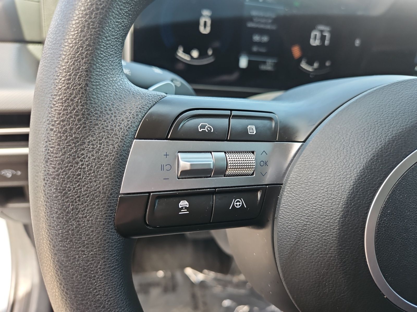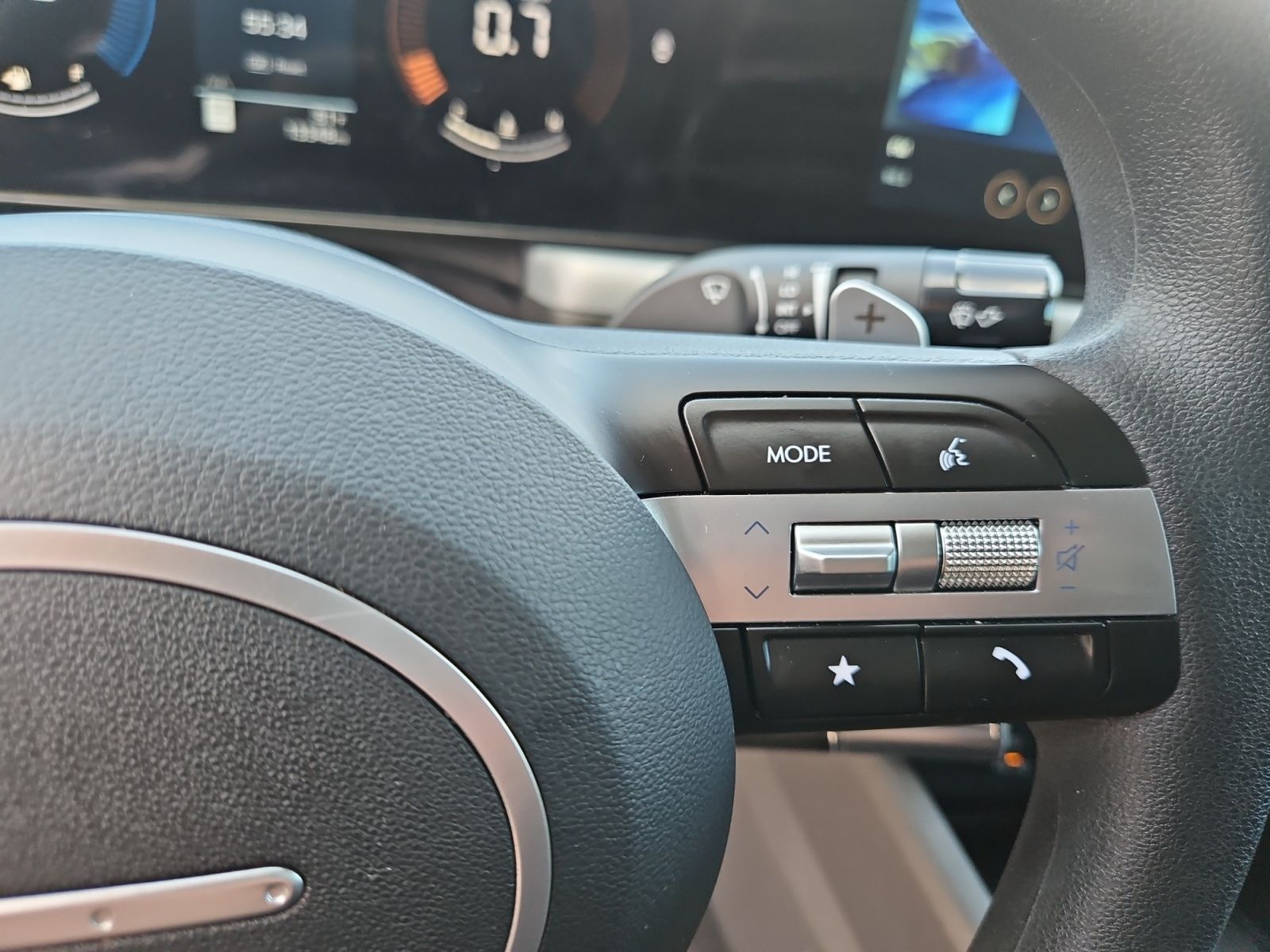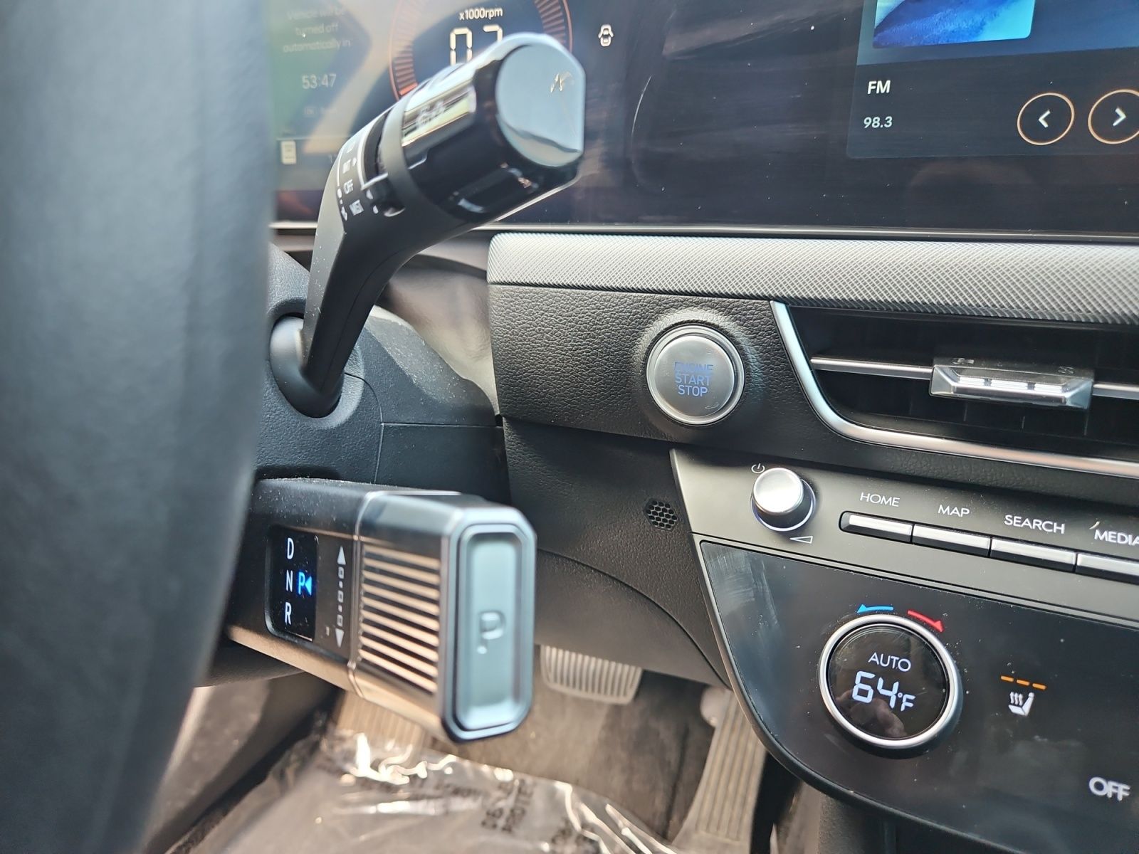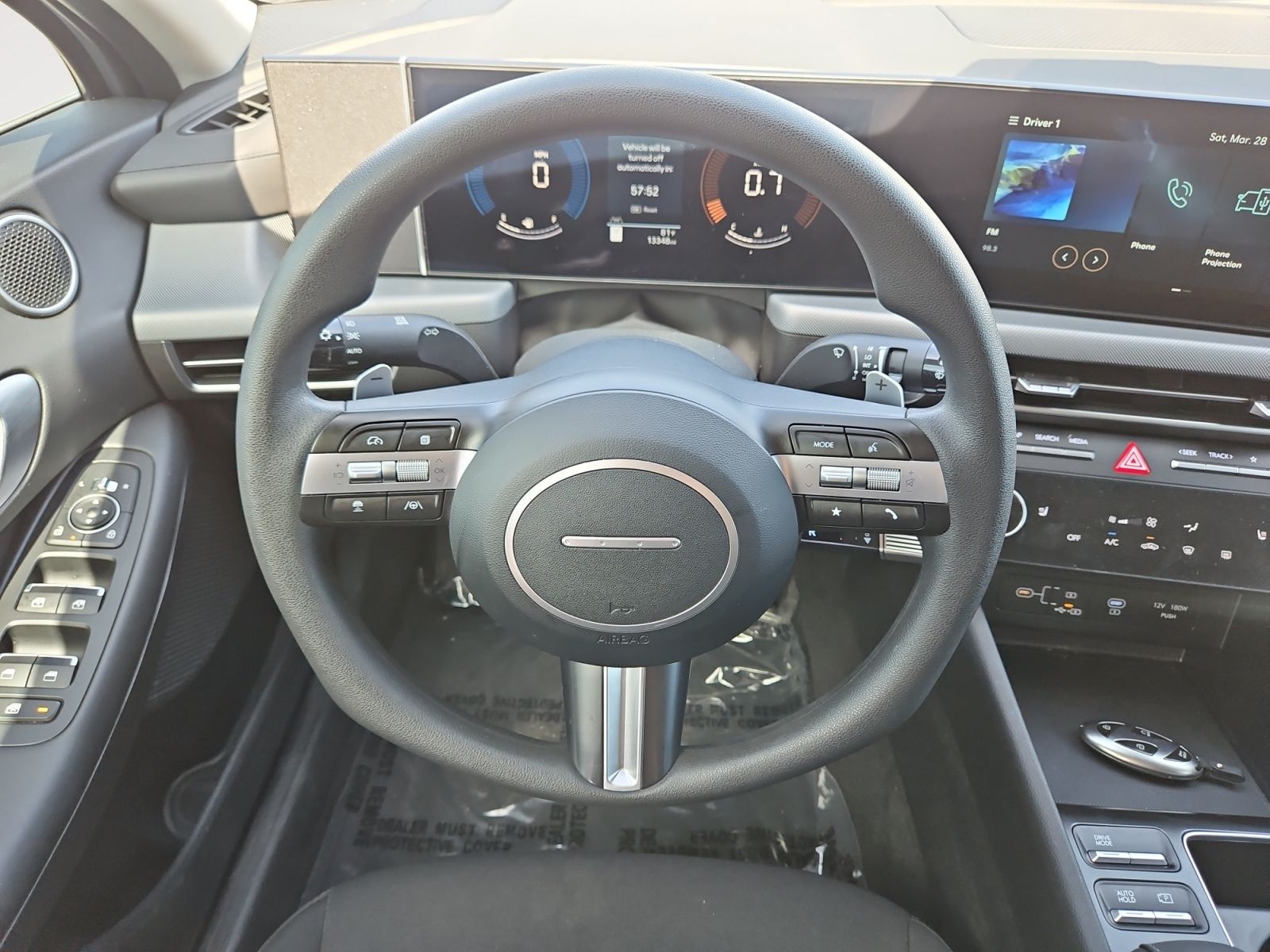 Leather-wrapped steering wheel and shift-by-wire system.