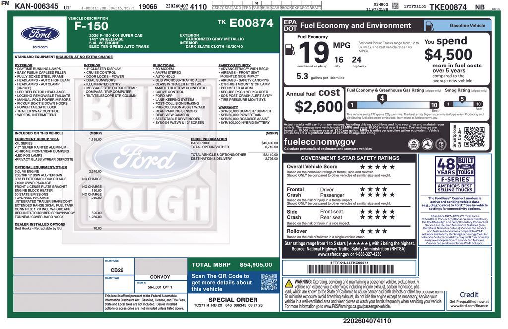 This 2026 Carbonized Gray Metallic Ford F-150 XL 4WD is well equipped and includes these features and benefits: Ford Connectivity Package (1-Year Included), GVWR: 6,550 lbs Payload Package, Internet access capable: 5G Modem - Ford Connectivity Package, 4WD, 3.55 Axle Ratio, 4-Wheel Disc Brakes, 6 Speakers, ABS brakes, Air Conditioning, AM/FM radio: SiriusXM with 360L, Auto High-beam Headlights, Brake assist, Cloth 40/20/40 Front Seat, Compass, Delay-off headlights, Driver door bin, Dual front impact airbags, Dual front side impact airbags, Electronic Stability Control, Emergency communication system: SYNC 4 911 Assist, Front anti-roll bar, Front Center Armrest, Front reading lights, Front wheel independent suspension, Fully automatic headlights, Heated door mirrors, Illuminated entry, Low tire pressure warning, Occupant sensing airbag, Outside temperature display, Overhead airbag, Overhead console, Panic alarm, Passenger door bin, Passenger vanity mirror, Power door mirrors, Power steering, Power windows, Radio data system, Radio: AM/FM Stereo with SiriusXM 360L, Rear step bumper, Remote keyless entry, Security system, Speed control, Split folding rear seat, Steering wheel mounted audio controls, SYNC 4 with Enhanced Voice Recognition, Tachometer, Telescoping steering wheel, Tilt steering wheel, Traction control, Trip computer, Variably intermittent wipers, and Wheels: 17'' Silver Steel.