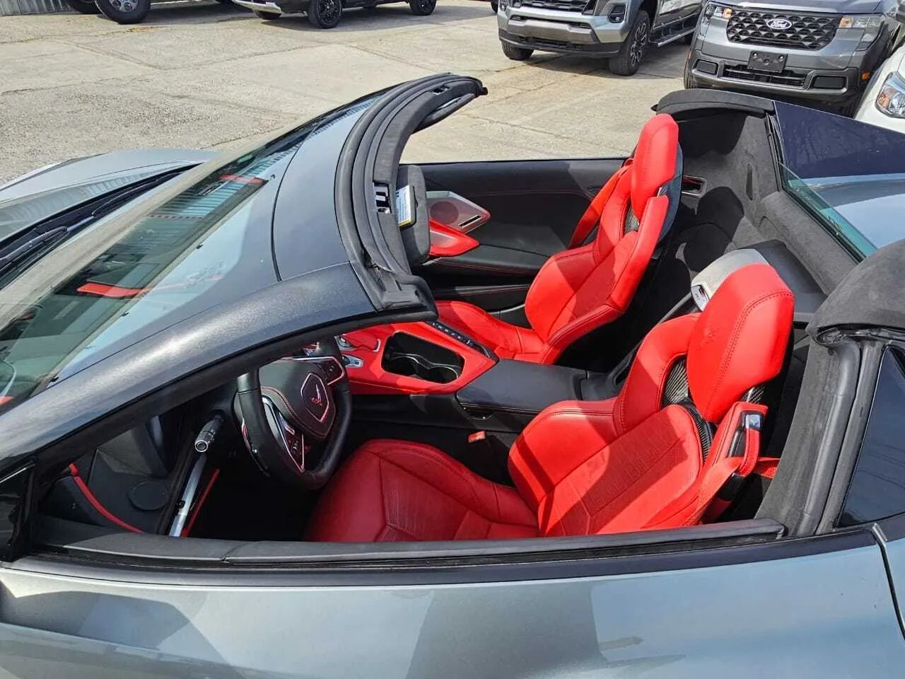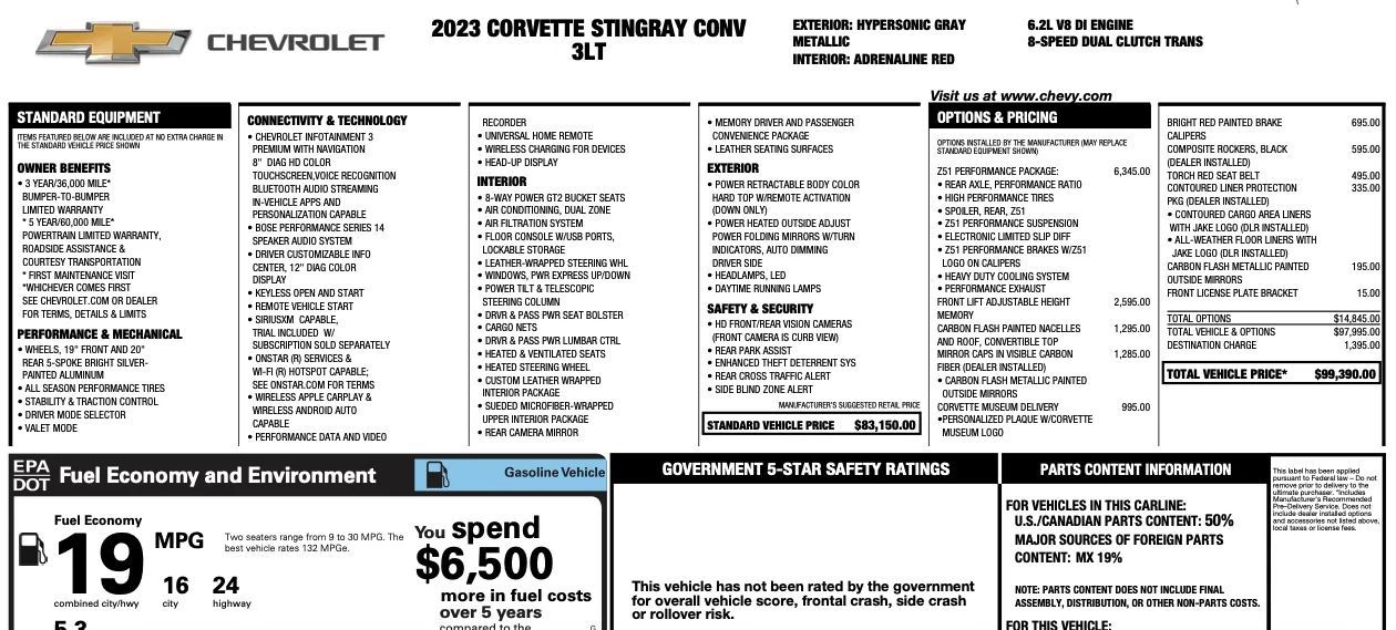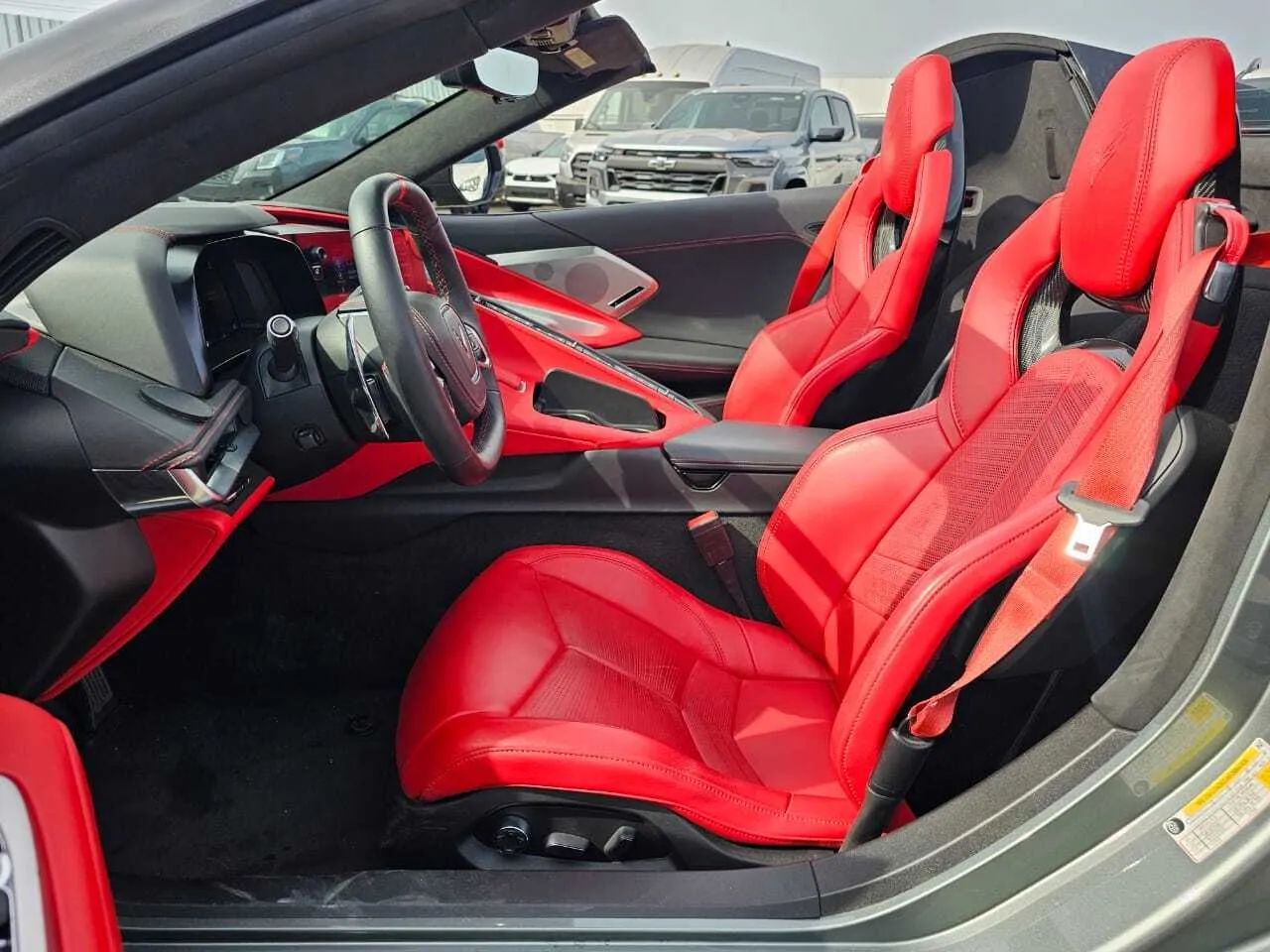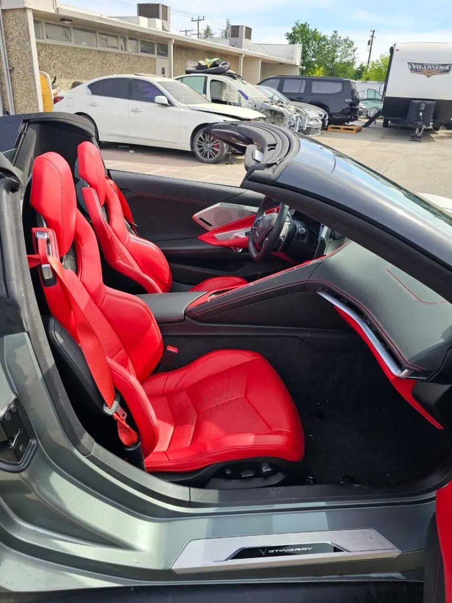 Leather Upholstery, Head-up display, Proximity Entry System Multi-function remote, Ventilated Driver seat, Ventilated Passenger seat, Heated steering wheel, Leather Steering wheel trim, Automatic Climate Control Front air conditioning, Driver Seat Memorized settings, Passenger Seat Memorized settings, Steering Wheel Memorized settings, Side Mirrors Memorized settings, Dual Front air conditioning zones, 8 Driver seat power adjustments, Power Tilt And Telescopic Steering wheel, Paddle Shifter Steering wheel mounted controls, Front Wireless charging station, Faux Suede Interior accents, Faux Suede Headliner trim, Push-button start, Heated Driver seat, Remote engine start, Heated Passenger seat, Homelink - Garage Door Opener Universal remote transmitter, Camera-based Rearview mirror, Auto-dimming Rearview mirror, Sport Bucket Front seat, 12 In. Instrument cluster screen size, 8 Passenger seat power adjustments, Variable/speed-proportional Power steering, Cruise control, Leather Dash trim, Leather Center console trim, Leather Door trim, Ambient lighting, Carpet Floor mat material, 2 Driver Memorized settings, Air filtration, Customizable instrument cluster, USB Front Power outlet(s), USB-C Front Power outlet(s), 12V Cargo Area Power outlet(s), 12V Front Power outlet(s), Rear Bulkhead Storage, Front Floor mats, Multi-function display, Oil Pressure Gauge, Front Console With Armrest And Storage Center console, Compass, Vehicle And Key Memory Multi-function remote, External temperature display, Perforated Upholstery accents, MPG Fuel economy display, Range Fuel economy display, Cargo Net Storage, Front Reading lights, Tachometer Gauge, Lumbar Driver seat power adjustments, Lumbar Passenger seat power adjustments, Reclining Passenger seat power adjustments, Reclining Driver seat power adjustments, Height Driver seat power adjustments, Height Passenger seat power adjustments, Front Cupholders, Maintenance Due Warnings and reminders, Dual Illuminating Vanity mirrors, Cargo area light, 2 One-touch windows, Panic Alarm Multi-function remote, Audio Steering wheel mounted controls, Cargo Tie-down Anchors And Hooks Storage, Carpet Floor material, Cruise Control Steering wheel mounted controls, Phone Steering wheel mounted controls, Multi-function Steering wheel mounted controls, Voice Control Steering wheel mounted controls, Covered Cupholders, Trunk Release Multi-function remote, Power Retractable Hard Top Convertible roof, Painted Aluminum Alloy Wheels, LED Headlights, LED Daytime running lights, Quad Tip Exhaust, LED Taillights, Power Folding Side mirror adjustments, Soft Close Rear trunk/liftgate, Driver Side Auto-dimming Side mirrors, Safety Reverse Power windows, Run flat tires, Power Side mirror adjustments, Heated Side mirrors, Approach Lamps Exterior entry lights, Rear Window defogger, Variable Intermittent Front wipers, Tire Pressure Monitoring System, Integrated Turn Signals Side mirrors, Reverse Gear Tilt Side mirror adjustments, Solar-tinted glass, Auto On/off Headlights, Remote Operation Convertible roof, Auto Delay Off Headlights, Wiper Activated Headlights, Black Window trim, Black Door handle color, Black Grille color, Stainless Steel Exhaust tip color, Hotspot Wi-Fi, Touch Screen Display Navigation system, Voice Operated Navigation system, Bose Premium brand, Wireless Apple CarPlay Smartphone integration, Wireless Android Auto Smartphone integration, MyChevrolet With Connected Access Smart device app compatibility, 12 Total speakers, Bluetooth Wireless data link, Voice Operated Hands-free phone call integration, Voice Operated Radio, Bluetooth Auxiliary audio input, Surround sound, HD Radio Radio, 2 Subwoofer, 8 In. Infotainment screen size, Touch Screen Display Radio, Real Time Traffic Navigation data, App Marketplace Integration Connected in-car apps, With Read Function Electronic messaging assistance, Voice Operated Electronic messaging assistance, SiriusXM Satellite radio, Digital sound processing, USB Auxiliary audio input, IPod/iPhone Auxiliary audio input, OnStar Satellite communications, Voice Guided Directions Satellite communications, Lock Operation Smart device app function, Chevrolet Infotainment System Infotainment, Horn/light Operation Smart device app function, Maintenance Status Smart device app function, Jack Auxiliary audio input, Roadside Assistance Driver assistance app, AM/FM Radio, Radio data system, Driving Performance Connected in-car apps, Speed sensitive volume control, Google POIs Connected in-car apps, Google Search Connected in-car apps, Send Destination To Vehicle Navigation data, Sensor/alert Blind spot safety, Rear Cross traffic alert, Front Camera system, Rearview Camera system, Front Side airbags, Rear Parking sensors, Front Recording Dash camera, 4-wheel ABS, Interior Motion Sensor Anti-theft system, Anti-tow Sensor Anti-theft system, Anti-lockout Power door locks, Auto-locking Power door locks, Programmable safety key, Painted brake calipers, Auto Off Electronic parking brake, Ventilated Disc Rear brake, Alarm Anti-theft system, Braking assist, Hill holder control, Ventilated Disc Front brake, Dual Front airbags, Vehicle Immobilizer Anti-theft system, Power brakes, Electronic brakeforce distribution, Stability control, Traction control, In Dash Rearview monitor, Occupant Sensing Passenger Airbag deactivation, Front Seatbelt pretensioners, Front Emergency locking retractors, Front Seatbelt warning sensor, Mid-mounted engine, Rear Limited slip differential, Cylinder deactivation, Sport Tuned suspension, Auxiliary oil cooler, Drive mode selector, Independent Front suspension classification, Independent Rear suspension classification, Short And Long Arm Rear suspension, Front struts, Rear struts, Short And Long Arm Front suspension, Monotube Front shock, Monotube Rear shock, Front stabilizer bar, Rear stabilizer bar, Battery saver