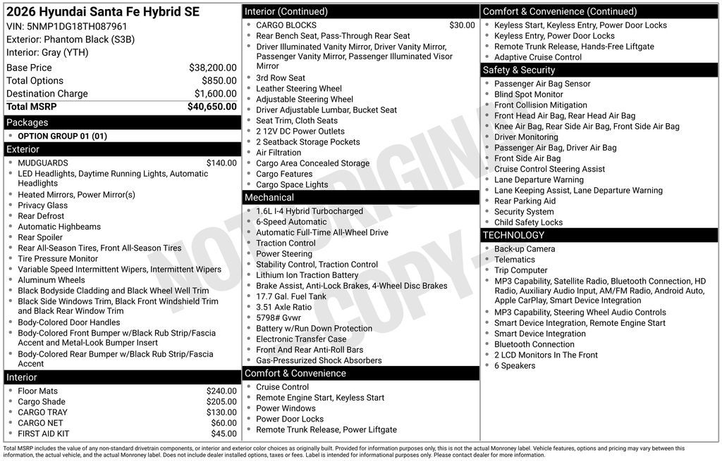 Phantom Black 2026 Hyundai Santa Fe Hybrid SE AWD 6-Speed Automatic with Shiftronic I4 35/34 City/Highway MPG 18'' x 7.5J Alloy Wheels, ABS brakes, Active Cruise Control, Alloy wheels, Electronic Stability Control, Emergency communication system, Front dual zone A/C, Heated door mirrors, Illuminated entry, Low tire pressure warning, Power Liftgate, Remote keyless entry, Traction control. Price includes the following incentives, not all customers will qualify. See dealer for details. : $4000 - Hyundai HMF Dealer Choice : $4000 discount and 5.39% APR for 24 months. $44.05 per $1000 financed. Available to well qualified buyers who finance through Hyundai Motor Finance. H704. Exp. 03/31/2026
