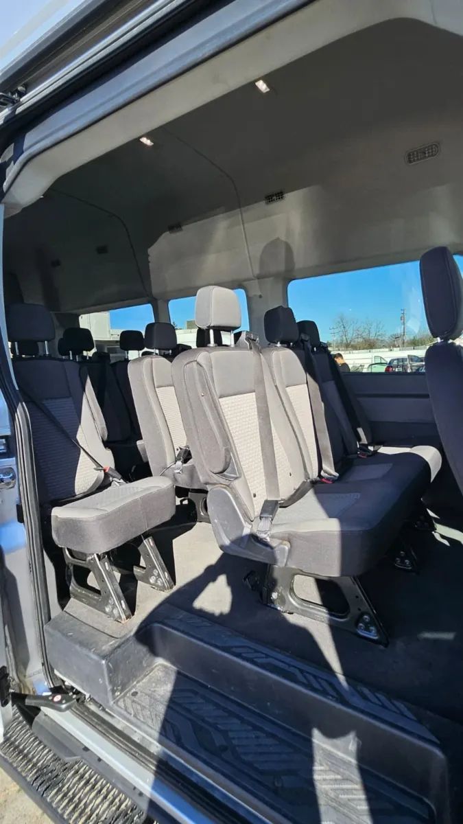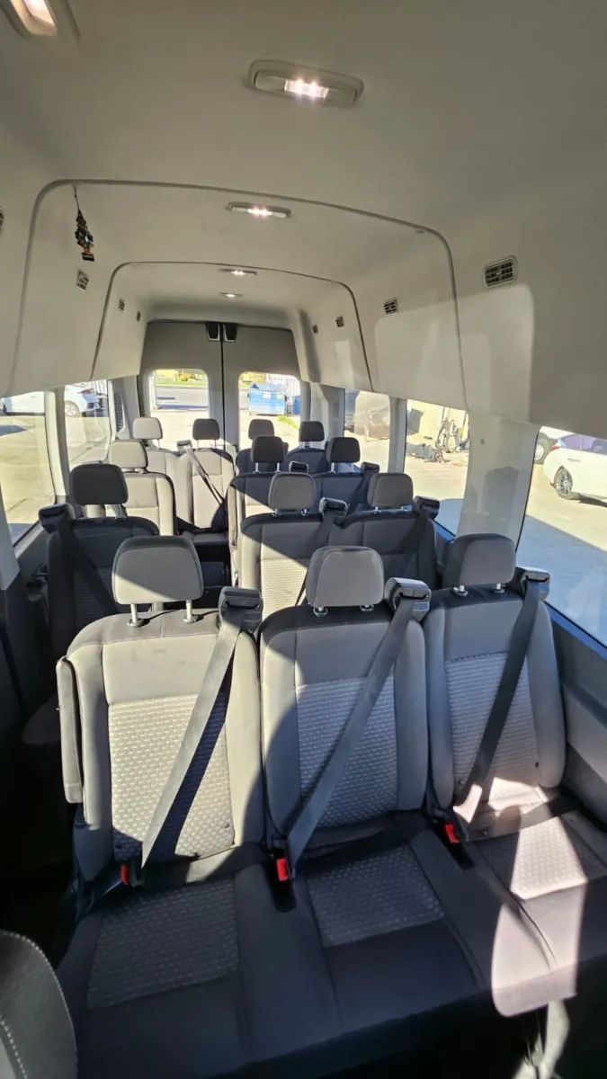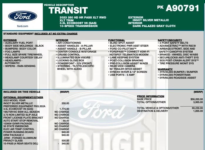 Front Pedestrian Automatic emergency braking, Front Automatic emergency braking, Pedestrian Detection Pre-collision warning system, Driver attention alert system, Audible Warning Pre-collision warning system, Visual Warning Pre-collision warning system, Lane deviation sensors, Rearview Camera system, Front Side airbags, Rear Side curtain airbags, Front Side curtain airbags, Third Row Side curtain airbags, Fourth Row Side curtain airbags, Fifth Row Side curtain airbags, 4-wheel ABS, Emergency braking preparation, Cornering brake control, Auto-locking Power door locks, Crosswind stabilization, Trailer stability control, Ventilated Disc Rear brake, Alarm Anti-theft system, Braking assist, Hill holder control, Ventilated Disc Front brake, Dual Front airbags, Vehicle Immobilizer Anti-theft system, Power brakes, LATCH System Child seat anchors, Electronic brakeforce distribution, Stability control, Traction control, In Dash Rearview monitor, Occupant Sensing Passenger Airbag deactivation, Front Seatbelt pretensioners, Front Emergency locking retractors, Post-collision Safety System Impact sensor, Door Unlock Impact sensor, Roll stability control, Front Seatbelt warning sensor, Hotspot Wi-Fi, FordPass Connect Smart device app compatibility, Bluetooth Wireless data link, Bluetooth Auxiliary audio input, Engine Start Smart device app function, 8 Total speakers, USB Auxiliary audio input, Vehicle Location Smart device app function, Lock Operation Smart device app function, Maintenance Status Smart device app function, AM/FM Radio, Proximity Entry System Multi-function remote, Rear air conditioning, Variable/speed-proportional Power steering, Cloth Upholstery, Bucket Front seat, Keyless Entry Multi-function remote, Split-bench Third row seat, Bench Rear seat, Capless fuel filler system, 50-50 Split Bench Fifth row seat, Split-bench Fourth row seat, USB Front Power outlet(s), USB Rear Power outlet(s), 12V Front Power outlet(s), Tilt And Telescopic Steering wheel, Lumbar Driver seat manual adjustments, USB Third Row Power outlet(s), External temperature display, Range Fuel economy display, Front Console With Storage Center console, Front Reading lights, Tachometer Gauge, Manual Day/night Rearview mirror, USB Fourth Row Power outlet(s), USB Fifth Row Power outlet(s), Front Cupholders, Dual Illuminating Vanity mirrors, Cargo area light, 1 One-touch windows, Panic Alarm Multi-function remote, Audio Steering wheel mounted controls, Phone Steering wheel mounted controls, Multi-function Steering wheel mounted controls, Single Front air conditioning zones, Single Rear air conditioning zones, Trunk Release Multi-function remote, Dual Front Armrests, High OEM roof height, Rain Sensing Front wipers, Auto High Beam Dimmer Headlights, Dual rear wheels, Safety Reverse Power windows, Power Side mirror adjustments, Steel Wheels, Steel Spare wheel, Rear Window defogger, Variable Intermittent Front wipers, Tire Pressure Monitoring System, Solar-tinted glass, Full-size Spare tire size, Auto On/off Headlights, Auto Delay Off Headlights, Roof-mounted lights, Passenger-side Manual Sliding Side door, Fixed Liftgate window, Barn Rear trunk/liftgate, Black Rear bumper color, Black Window trim, Black Door handle color, Black Mirror color, Black Grille color, Black Body side moldings, Trailer brake controller, Auto start/stop, Trailer wiring, 4-pin Trailer wiring, 7-pin Trailer wiring, Trailer hitch, AGM Battery, Independent Front suspension classification, MacPherson Front struts, 250 Amps Alternator, Auxiliary transmission fluid cooler, Solid Live Axle Rear suspension classification, Front stabilizer bar