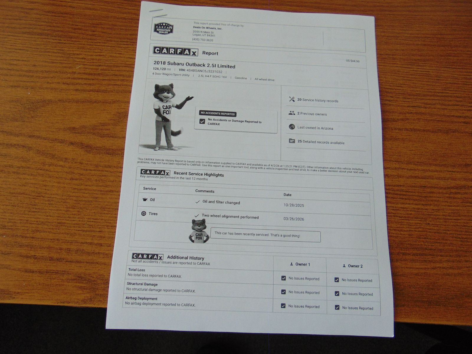 CLEAN CARFAX AND NO ACCIDENTS REPORTED ON THIS 2018 SUBARU OUTBACK 2.5i LIMITED AWD WITH THE 2.5L 4 CYLINDER MOTOR, AUTOMATIC TRANSMISSION, AND 126,123 MILES. THIS OUTBACK COMES EQUIPPED WITH BLACK LEATHER INTERIOR, DUAL FRONT POWER/HEATED SEATS, DRIVER MEMORY SEAT, REAR HEATED SEATS, 5 PASSENGER SEATING, POWER WINDOWS, LOCKS, AND MIRRORS, TILT, ADAPTIVE CRUISE, A/C, DUAL ZONE CLIMATE CONTROLS, AM/FM/XM HARMAN KARDON CD PLAYER, BLUETOOTH, APPLE CARPLAY, ANDROID AUTO, USB/AUX. PORTS, STEERING WHEEL AUDIO CONTROLS, NAVIGATION, EYESIGHT PACKAGE, REVERSE CAMERA, BLIND SPOT MONITOR, LANE ASSIST, COLLISION AVOIDANCE, REVERSE SENSORS, POWER SUNROOR, UNIVERSAL GARAGE DOOR OPENER, REAR POWER LIFTGATE, ROOF RACK, ALLOY WHEELS, GOOD TIRES, TOW PACKAGE, AND MUCH MORE!! THIS OUTBACK IS ON A CLEAN TITLE AND ACTUAL MILES! IT IS IN EXCELLENT CONDITION INSIDE AND OUT.
