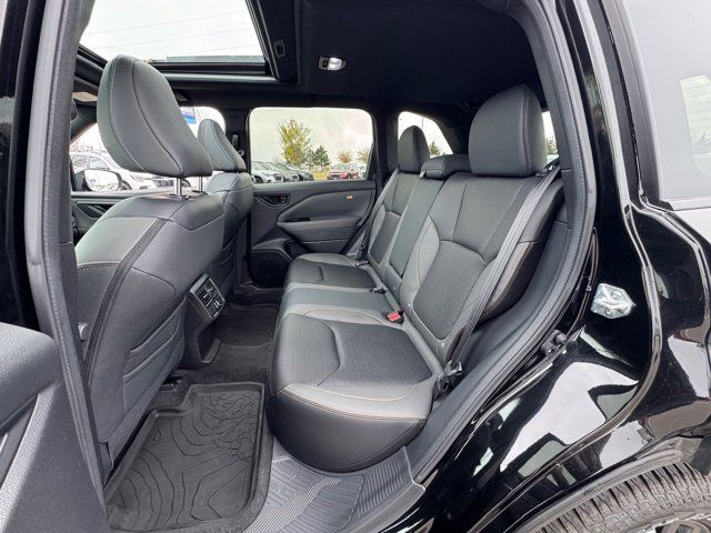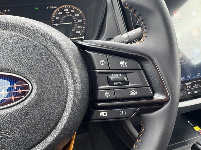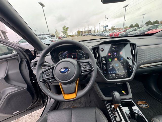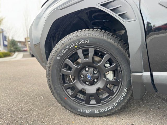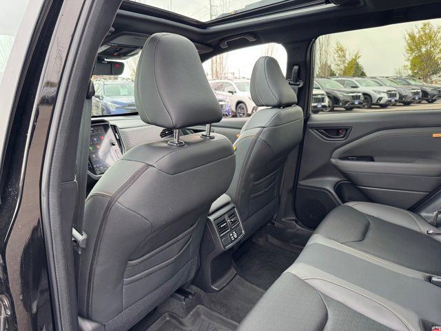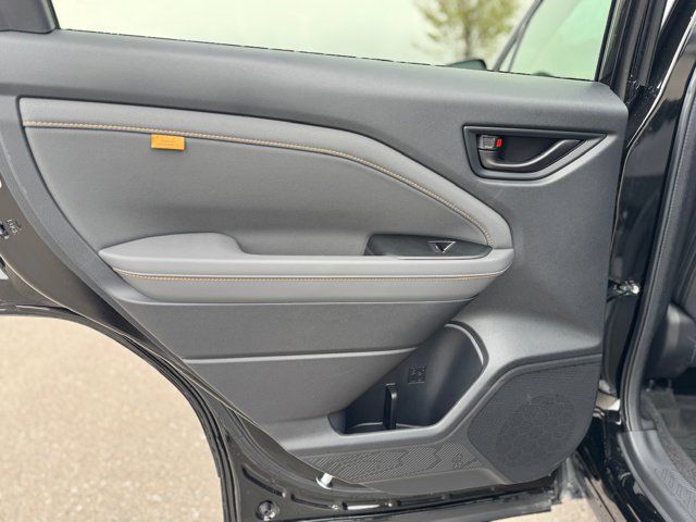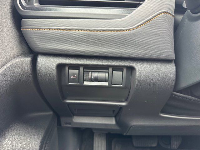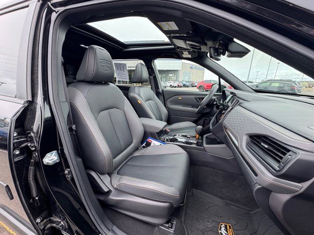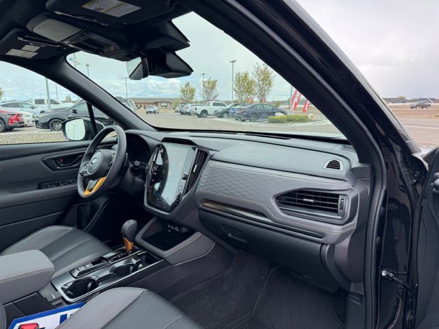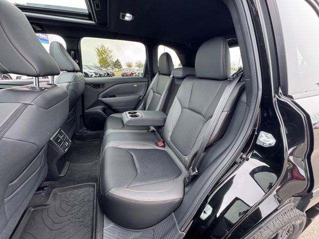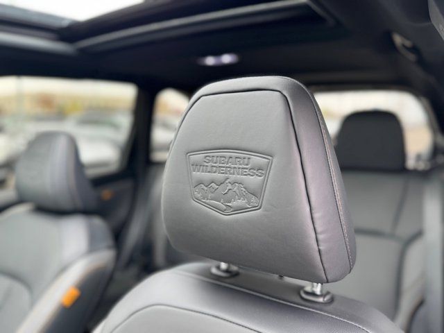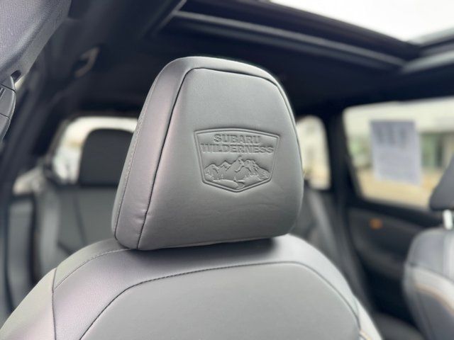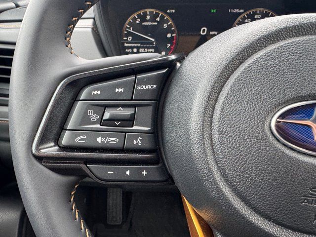AUTO-DIMMING MIRROR W/COMPASS & HOMELINK -inc: Part number H501SAN000,SPLASH GUARDS -inc: Part number J101SSL300,GRAY TEXTURED STARTEX UPHOLSTERY -inc: silver and copper stitching and embossed Subaru Wilderness logo on head restraints,CRYSTAL BLACK SILICA,HARMAN/KARDON SPEAKER SYSTEM & POWER REAR GATE -inc: Power Rear Gate automatic close and height memory hand pressure sensing automatic close and illuminated close and lock switch Radio: Subaru 11.6 Multimedia Navigation System valet mode integrated center information display AM/FM stereo HD Radio multitouch gesture high resolution display screen voice activated controls voice activated navigation Bluetooth audio streaming and hands-free phone connectivity w/SMS text messaging (refer to Subaru.com for cellphone compatibility) TomTom navigation software w/what3words iPod control capability smartphone integration: Android Auto and Apple CarPlay w/full screen view and wireless connection USB and Over The Air (OTA) audio system update USB and Map Over The Air (MOTA) TomTom navigation system update (3 years free map updates) steering wheel controls harman/kardon speaker system w/11 speakers and 576 watt equivalent maximum output amplifier 3.5mm auxiliary input jack and ro,AUTO-DIMMING EXTERIOR MIRROR W/APPROACH LIGHT -inc: Part number J201SFN001,All Wheel Drive,Power Steering,ABS,4-Wheel Disc Brakes,Brake Assist,Brake Actuated Limited Slip Differential,Aluminum Wheels,Tires - Front All-Terrain,Tires - Rear All-Terrain,Conventional Spare Tire,Sun/Moonroof,Generic Sun/Moonroof,Panoramic Roof,Heated Mirrors,Power Mirror(s),Integrated Turn Signal Mirrors,Rear Defrost,Privacy Glass,Intermittent Wipers,Variable Speed Intermittent Wipers,Rain Sensing Wipers,Rear Spoiler,Power Door Locks,Daytime Running Lights,Automatic Headlights,Headlights-Auto-Leveling,LED Headlights,Automatic Highbeams,Fog Lamps,AM/FM Stereo,Satellite Radio,MP3 Capability,Steering Wheel Audio Controls,Bluetooth Connection,Auxiliary Audio Input,HD Radio,Smart Device Integration,Requires Subscription,MP3 Capability,Bluetooth Connection,Power Driver Seat,Bucket Seats,Heated Front Seat(s),Driver Adjustable Lumbar,Pass-Through Rear Seat,Rear Bench Seat,Adjustable Steering Wheel,Trip Computer,Power Windows,WiFi Hotspot,Keyless Entry,Power Door Locks,Keyless Entry,Power Door Locks,Keyless Start,Cruise Control,Adaptive Cruise Control,Climate Control,Multi-Zone A/C,A/C,Premium Synthetic Seats,Driver Vanity Mirror,Passenger Vanity Mirror,Driver Illuminated Vanity Mirror,Passenger Illuminated Visor Mirror,Floor Mats,Cargo Shade,Keyless Start,Smart Device Integration,Power Door Locks,Power Windows,Trip Computer,Security System,Immobilizer,Cruise Control Steering Assist,Traction Control,Stability Control,Traction Control,Front Side Air Bag,Front Collision Mitigation,Driver Monitoring,Telematics,Requires Subscription,Blind Spot Monitor,Lane Departure Warning,Lane Keeping Assist,Lane Departure Warning,Evasion Assist,Cross-Traffic Alert,Rear Collision Mitigation,Tire Pressure Monitor,Driver Air Bag,Passenger Air Bag,Front Head Air Bag,Rear Head Air Bag,Passenger Air Bag Sensor,Knee Air Bag,Child Safety Locks,Back-Up Camera