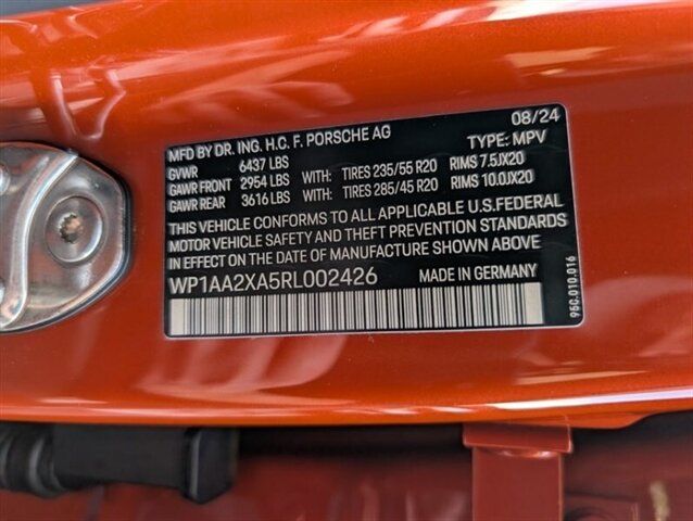 INSTALLED FEATURES: Air filtration: active charcoal, Front air conditioning: automatic climate control, Front air conditioning zones: dual, Humidity/dewpoint sensors, Rear air conditioning: automatic climate control / independently controlled, Rear air conditioning zones: single, Airbag deactivation: occupant sensing passenger, Front airbags: dual, Side airbags: front / rear, Side curtain airbags: front / rear, Antenna type: diversity / element, Auxiliary audio input: Bluetooth / iPod/iPhone / jack / memory card slot / USB, Hard drive, Radio: AM/FM / HD radio / touch screen display / voice operated, Radio data system, Satellite radio: SiriusXM, Speed sensitive volume control, Total speakers: 10, Watts: 150, ABS: 4-wheel, Brake drying, Braking assist, Electronic brakeforce distribution, Electronic parking brake: auto off, Front brake type: ventilated disc, Painted brake calipers, Power brakes, Rear brake type: ventilated disc, Regenerative braking system, Armrests: rear center folding with storage and pass-thru / rear center with cupholders, Cargo area floor mat: carpet, Center console trim: leather, Dash trim: leatherette, Door sill trim: aluminum, Door trim: leather, Floor mat material: carpet, Floor material: carpet, Floor mats: front / rear, Heated steering wheel, Interior accents: metallic-tone, Steering wheel trim: leather, Adaptive cruise control, Adaptive stop and go cruise control: fully automated, Ambient lighting: color-adjustable, Assist handle: front / rear, Cargo area light, Cargo cover: hard, Center console: front console with armrest and storage, Courtesy lights: door, Cupholders: front / illuminated / rear, Footwell lights: color-adjustable, Memorized settings: liftgate, Multi-function remote: proximity entry system / trunk release, One-touch windows: 4, Power outlet(s): 12V cargo area / 12V front / USB-C front / USB-C rear, Power steering: variable/speed-proportional, Power windows: lockout button, Push-button start, Reading lights: front / rear, Rearview mirror: auto-dimming, Steering wheel: tilt and telescopic, Steering wheel mounted controls: audio / cruise control / multi-function / phone / voice control, Storage: accessory hook / cargo tie-down anchors and hooks / door pockets / front seatback, Universal remote transmitter: Homelink - garage door opener, Vanity mirrors: dual illuminating, Wireless charging station: front, Active grille shutters, Body side moldings: black, Door handle color: body-color, Fender lip moldings: black, Front bumper color: body-color, Grille color: black, Mirror color: body-color, Rear bumper color: body-color, Rear trunk/liftgate: liftgate / power operated / sensor-activated, Window trim: black, Infotainment: Porsche Communication Management, Infotainment screen size: 10.9 in., Smartphone integration: wireless Apple CarPlay, Clock, Compass, Digital odometer, External temperature display, Fuel economy display: MPG / range, Gauge: tachometer, Instrument cluster screen size: 12.6 in., Multi-function display, Trip odometer, Warnings and reminders: lamp failure / low oil pressure / maintenance due, Daytime running lights: LED, Exterior entry lights: approach lamps, Front fog lights, Headlight cleaners, Headlights: auto delay off / auto on/off / cornering / LED / self-leveling, Taillights: LED, Side mirror adjustments: power / power folding / reverse gear tilt, Side mirrors: auto-dimming / heated / integrated turn signals, 4WD type: full time, Auto start/stop, Battery: maintenance-free, Drive mode selector, Electric charge cord: 120 volt / 240 volt, Electric motor battery type: lithium ion, Electric motor charger: DC fast charging, Electric motor charger connector: SAE Combo CCS, Electric motor charging time (240V): 11 hours, EV battery capacity: 100 kWh, Limited slip differential: center, Moonroof / Sunroof: anti-trapping / one-touch open/close / power panoramic / power sunshade, Automatic emergency braking: front / front pedestrian / intersection/junction cross, Blind spot safety: sensor/alert, Camera system: rearview, Child safety door locks, Child seat anchors: LATCH system, Cross traffic alert: rear, Crumple zones: front / rear, Driver attention alert system, Impact sensor: post-collision safety system, Lane deviation sensors, Lane keeping assist, Parking sensors: front / rear, Pedestrian safety sound generation, Pre-collision warning system: audible warning / intersection/junction cross / pedestrian detection / visual warning, Rearview monitor: in dash, Traffic sign recognition, Vehicle exit safety system, Emergency locking retractors: front, Front seatbelts: 3-point, Rear seatbelts: 3-point, Seatbelt force limiters: front / rear, Seatbelt pretensioners: front / rear, Seatbelt warning sensor: front, Driver seat: heated, Driver seat power adjustments: 8 / height / reclining, Front headrests: 2 / adjustable, Front seat type: bucket, Passenger seat: heated, Passenger seat power adjustments: 8 / height / reclining, Rear headrests: 3 / adjustable, Rear seat folding: split, Rear seat type: 40-20-40 split bench, Upholstery: leather-trimmed, Anti-theft system: alarm / interior motion sensor / vehicle immobilizer, Power door locks: auto-locking, Hill holder control, Off-road driving assist: hill descent, Stability control, Traction control, Trailer stability control, Active suspension, Air suspension, Driver adjustable suspension: height / ride control, Front shock type: gas, Front spring type: pneumatic, Front stabilizer bar, Front struts, Front suspension classification: independent, Front suspension type: double wishbone, Rear shock type: gas, Rear spring type: pneumatic, Rear stabilizer bar, Rear suspension classification: independent, Rear suspension type: multi-link, Self leveling suspension, Suspension control: electronic, Tuned suspension: sport, Electronic messaging assistance: voice operated / with read function, Hands-free phone call integration: voice operated, Navigation data: real time traffic, Navigation system: hard drive / touch s
