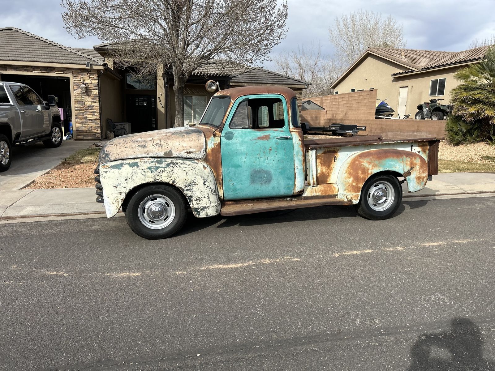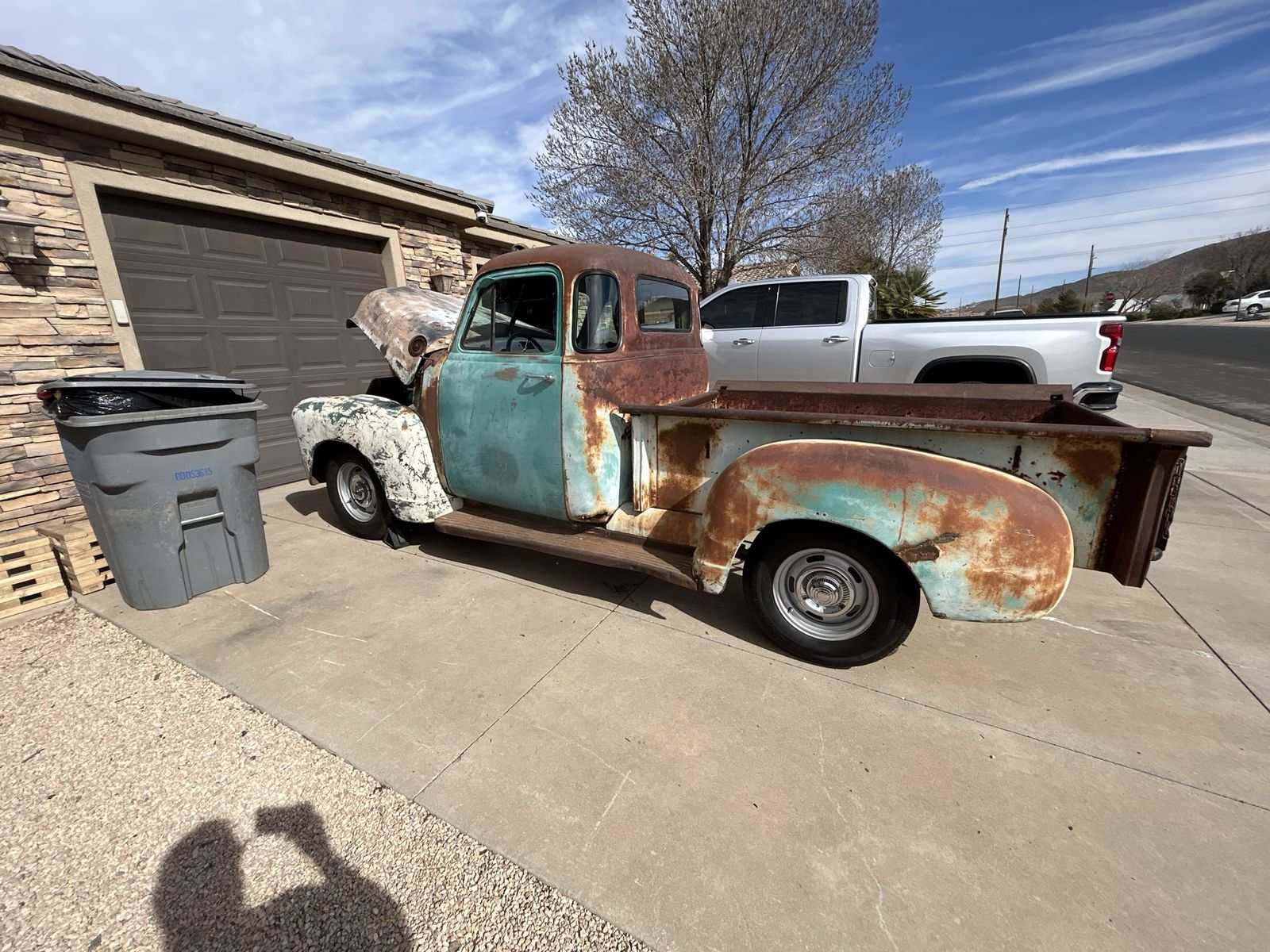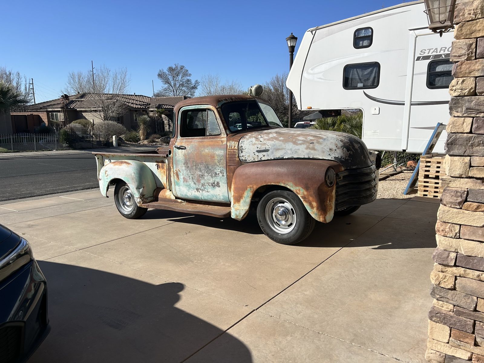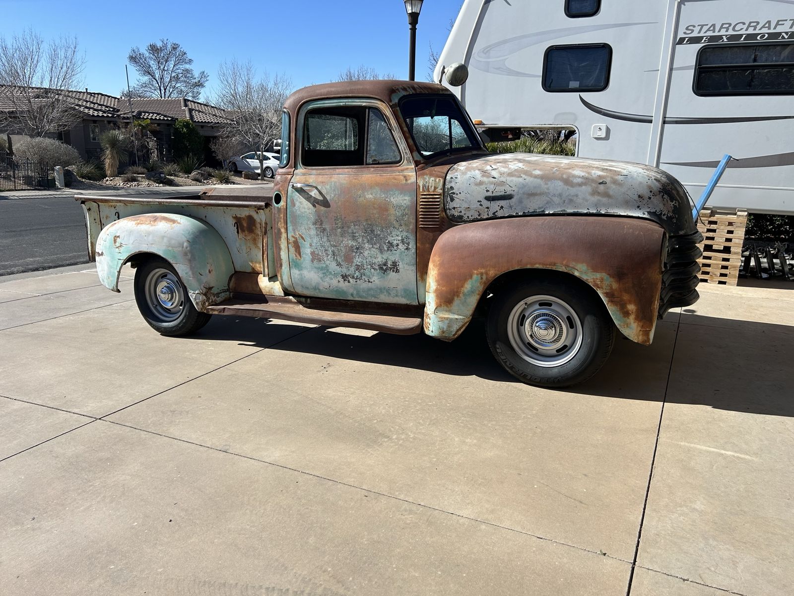 1953 chevy 3100 with a 5.3 LS & a 4l60e automatic transmission. All on an s10 frame with Russ-d mounts. Has a clean title and a ton of new parts. She’s still not 100% road worthy yet but it’s close.