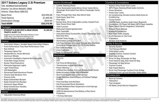 Turn every drive into something special with this Subaru Legacy from Salt Lake Valley Chevrolet! Designed for comfort, performance, and style, this vehicle comes fully equipped with modern technology and convenience features you’ll love. Price excludes tax, title, license fee, government fees, and $449 dealer documentary service fee. While every reasonable effort is made to ensure accuracy, we are not responsible for errors or omissions, and vehicles may be sold prior to inquiry—please contact the dealer to confirm availability. All financing is subject to approved credit. If you’re shopping for used cars in Salt Lake City, or searching for the perfect SUV, truck, or sedan, this Subaru Legacy delivers the dependability and value you’re looking for. It’s the ideal match for your lifestyle - ready for everything from mountain adventures to city commutes. Visit Salt Lake Valley Chevrolet today and see why so many Utah drivers trust us for great deals on quality pre-owned vehicles. Explore our inventory online at www.slvchevy.com or call 801-969-8221 to schedule your test drive today! This impressive vehicle includes EyeSight & Blind Spot & Rear Cross Traffic Alert (Blind Spot Detection (BSD), High Beam Assist, and Rear Cross Traffic Alert (RCTA)), 4-Wheel Disc Brakes, 6 Speakers, ABS brakes, Adaptive Cruise Control, Air Conditioning, Alloy wheels, AM/FM radio: SiriusXM, Anti-whiplash front head restraints, Automatic temperature control, Brake assist, Bumpers: body-color, CD player, Cloth Upholstery, Driver door bin, Driver vanity mirror, Dual front impact airbags, Dual front side impact airbags, Electronic Stability Control, Emergency communication system, Exterior Parking Camera Rear, Four wheel independent suspension, Front anti-roll bar, Front Bucket Seats, Front Center Armrest w/Storage, Front dual zone A/C, Front reading lights, Fully automatic headlights, Heated door mirrors, Heated front seats, Heated Reclining Front Bucket Seats, Illuminated entry, Lane Departure Warning System, Leather Shift Knob, Low tire pressure warning, Occupant sensing airbag, Outside temperature display, Overhead airbag, Overhead console, Panic alarm, Passenger door bin, Passenger vanity mirror, Power door mirrors, Power driver seat, Power steering, Power windows, Pre-Collision System, Radio: Subaru Starlink 7.0'' Multimedia Plus System, Rear anti-roll bar, Rear seat center armrest, Rear window defroster, Remote keyless entry, Security system, Smartphone Integration, Speed control, Speed-sensing steering, Split folding rear seat, Steering wheel mounted audio controls, Steering-Wheel Paddle-Shift Control Switches, Tachometer, Telescoping steering wheel, Tilt steering wheel, Traction control, Trip computer, Variably intermittent wipers, Vehicle Information Display, and Wheels: 17'' x 7.5'' Aluminum Alloy w/Silver Finish, offering everything you need for your next adventure.