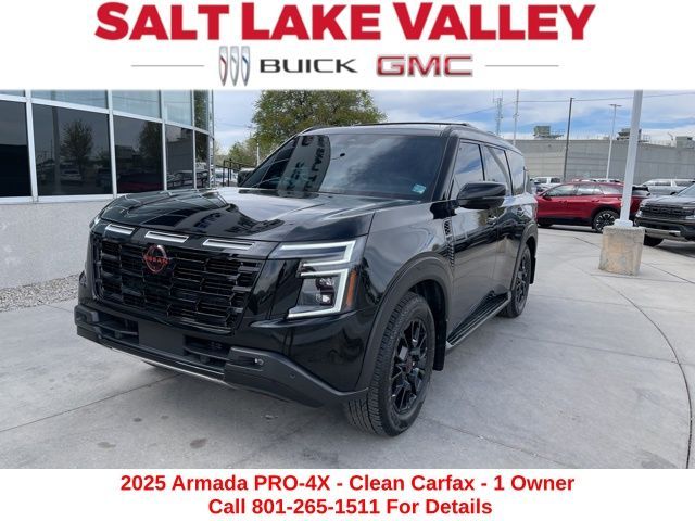 Take your drives to the next level with this Nissan Armada from Salt Lake Valley Buick GMC! Engineered for a smooth ride, advanced convenience, and lasting dependability, this vehicle is ready to handle everything your day throws at you. Price excludes tax, title, license fee, government fees, and $449 dealer documentary service fee. While every reasonable effort is made to ensure accuracy, we are not responsible for errors or omissions, and vehicles may be sold prior to inquiry—please contact the dealer to confirm availability. All financing is subject to approved credit. Looking for quality used cars in Salt Lake City? This Nissan Armada delivers style, versatility, and value - perfect for daily commutes, family trips, or weekend adventures. Stop by Salt Lake Valley Buick GMC to see this vehicle in person and explore our wide selection of pre-owned cars, trucks, and SUVs. Browse online at www.slvbuickgmc.com or call 801-265-1511 to schedule your test drive today! With PRO-4X Premium Package (Biometric Cooling, Hands-Free Power Liftgate, Heated & Ventilated Driver & Passenger Seats, Heated 2nd Row Seats, In-Car Camera, Intelligent Dash Cam, and Panoramic Moonroof), 12 Speakers, 3rd row seats: split-bench, 4-Wheel Disc Brakes, ABS brakes, Adaptive suspension, Air Conditioning, Alloy wheels, AM/FM radio: SiriusXM, Anti-whiplash front head restraints, Auto High-beam Headlights, Auto tilt-away steering wheel, Auto-dimming door mirrors, Auto-dimming Rear-View mirror, Auto-leveling suspension, Automatic temperature control, Brake assist, Bumpers: body-color, Delay-off headlights, Driver door bin, Driver vanity mirror, Dual front impact airbags, Dual front side impact airbags, Electronic Stability Control, Emergency communication system: NissanConnect Services, Four wheel independent suspension, Front anti-roll bar, Front Bucket Seats, Front Center Armrest, Front dual zone A/C, Front fog lights, Front reading lights, Front Tow Hooks, Fully automatic headlights, Garage door transmitter: myQ Connected Garage, Genuine wood dashboard insert, Heated door mirrors, Heated Front Bucket Seats, Heated front seats, Heated steering wheel, HVAC memory, Illuminated entry, Illuminated Kick Plates, Knee airbag, Leather steering wheel, Low tire pressure warning, Memory seat, Navigation System, Occupant sensing airbag, Outside temperature display, Overhead airbag, Overhead console, Panic alarm, Passenger door bin, Passenger vanity mirror, Power door mirrors, Power driver seat, Power Liftgate, Power passenger seat, Power steering, Power windows, PRO-4X Carpeted Floor Mats, PRO-4X Mud Guards, PRO-4X Unique Quilted Leather Seat Trim, Radio: NissanConnect w/SiriusXM 360L, Rain sensing wipers, Rear air conditioning, Rear anti-roll bar, Rear Bumper Protector, Rear reading lights, Rear seat center armrest, Rear window defroster, Rear window wiper, Reclining 3rd row seat, Remote keyless entry, Roof Rail Cross Bars, Security system, Speed control, Speed-sensing steering, Speed-Sensitive Wipers, Split folding rear seat, Spoiler, Steering wheel memory, Steering wheel mounted audio controls, Tachometer, Telescoping steering wheel, Tilt steering wheel, Traction control, Trip computer, Turn signal indicator mirrors, Variably intermittent wipers, Voltmeter, and Wheels: 20'' Painted PRO-4X Alloy designed for convenience and enjoyment, this Nissan Armada is ready to take you wherever you want to go.