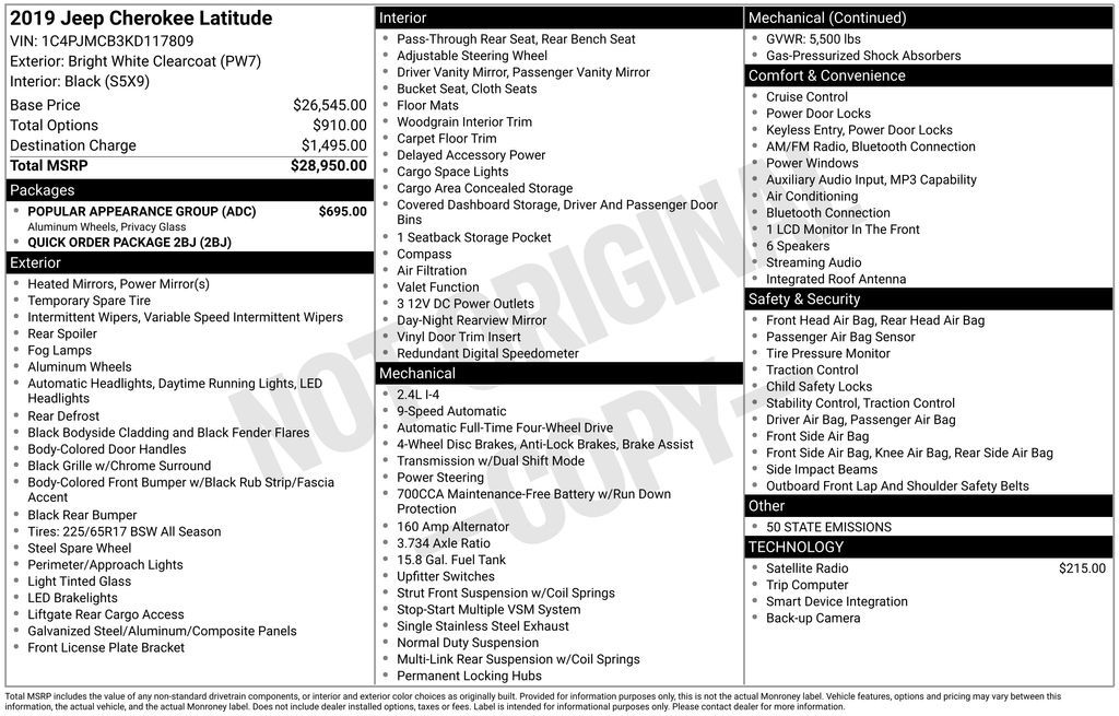 Bright White Clearcoat 2019 Jeep Cherokee Latitude 4WD 9-Speed 948TE Automatic 2.4L I4