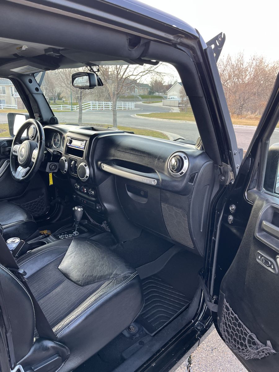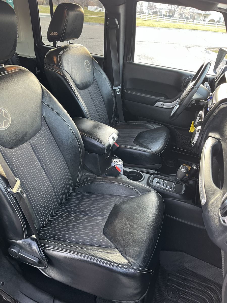 2013 Jeep Wrangler Oscar Mike Edition, part of the military-themed Freedom Edition, it is a special package featuring patriotic decals (stars, flags), unique badging, and upgraded interiors like leather seats with embossed logos.