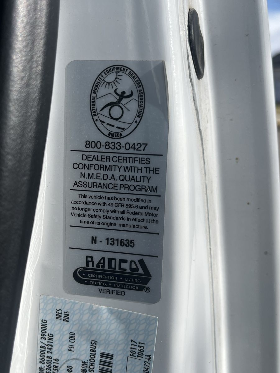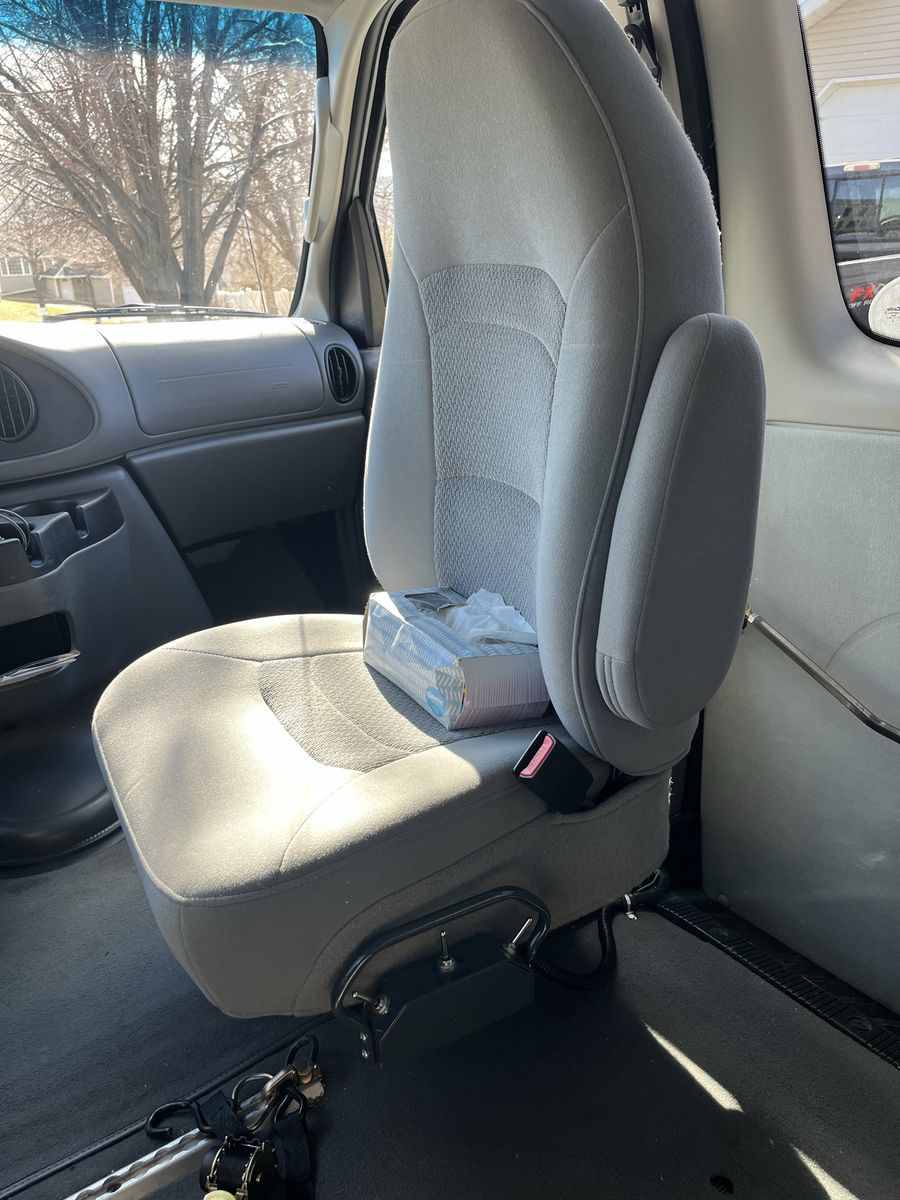 Front passenger seat custom modified for electric adjustability & rotation. One rear bench passenger seat in back.