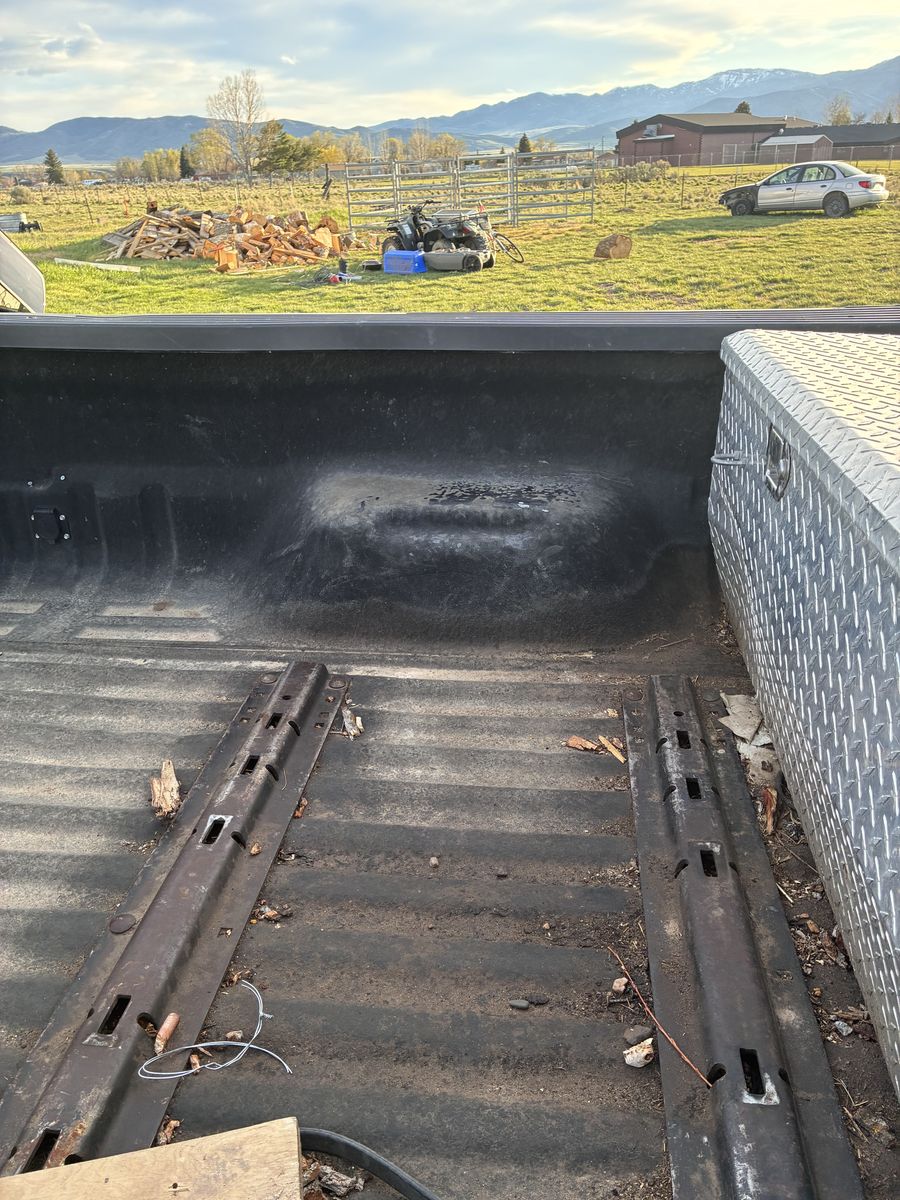 it has a short bed and comes with an aluminum toolbox. It has bed rails in the bed, which can fit a fifth wheel plate and a gooseneck plate that will come with the truck!