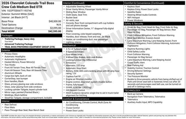 Discover the new Chevrolet Colorado at Salt Lake Valley Chevrolet in Salt Lake City! With bold design, modern technology, and reliable performance, Chevrolet makes every drive exciting. Whether it’s city streets or canyon roads, the Colorado is ready for anything. Call us today at 801-969-8221 to schedule a time to see it! --- 2026 Chevrolet Colorado Summit White 2.7L I4 Turbocharged DOHC 16V LEV3-ULEV50 310hp --- Final price excludes tax, tag, title, documentation fees, dealer-installed options, and any market-based pricing adjustments. Financing through GM Financial is required for all discounts to apply. Special finance offers may not be combined with certain factory incentives. While we strive for accuracy, errors may occur—please verify all information with a sales representative. For the most accurate pricing, call (801) 969-8221 or visit us in person. Prices and payments are subject to change based on manufacturer incentives.