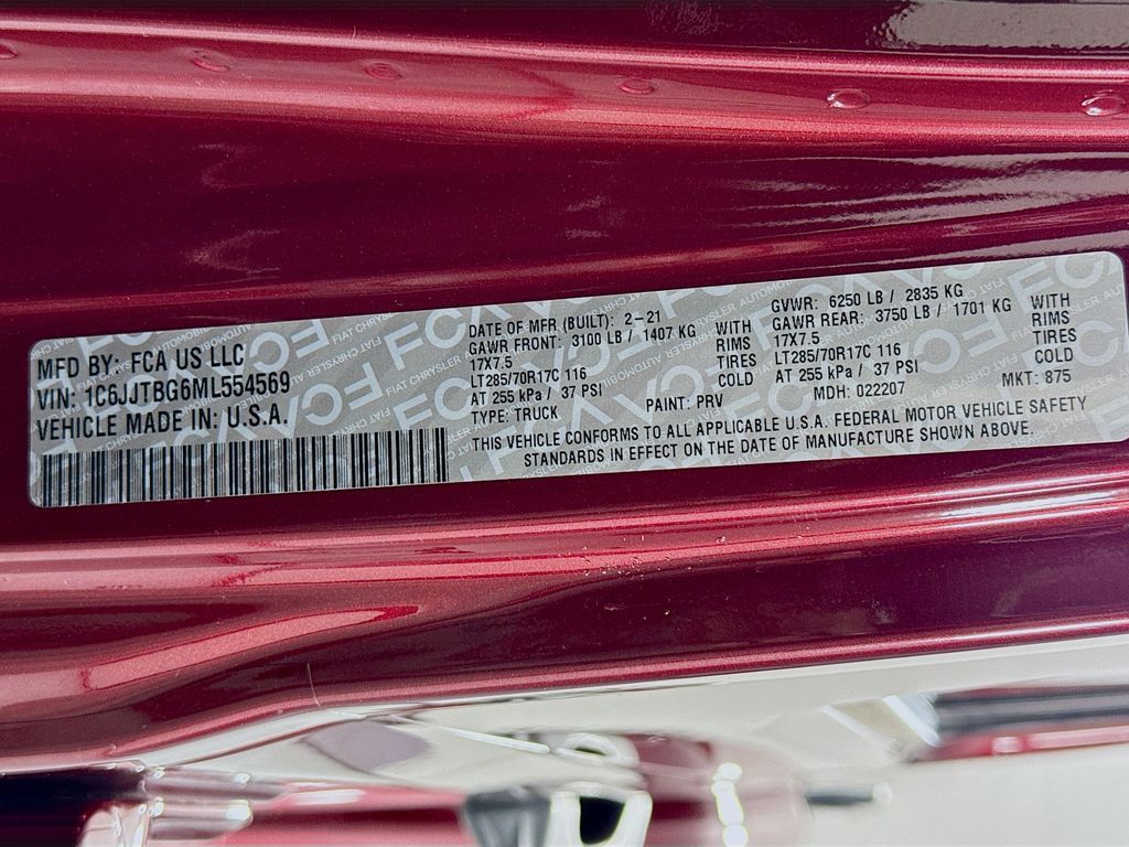 Advanced Safety Group: Advanced Brake Assist; Auto High Beam Headlamp Control; Adaptive Cruise Control with Stop; Full Speed Forward Collision Warning Plus. Cold Weather Group: Remote Start System; Heated Front Seats; Heated Steering Wheel. Safety Group: Blind Spot and Cross Path Detection; ParkSense Rear Park Assist System. LED Lighting Group: Daytime Running Lamps LED Accents; Front LED Fog Lamps; LED Premium Reflector Headlamps; LED Taillamps; LED Park Turn Lamps. Auxiliary Switch Group: 700 Amp Maintenance Free Battery; Auxiliary Switches; 240 Amp Alternator. 8.4" Radio and Premium Audio Group: SiriusXM Traffic Plus; Alpine Premium Audio System; HD Radio; Uconnect 4C Navigation Radio with 8.4" Display; Rear View Auto Dim Mirror; For Details. Visit DriveUconnect.com; 1-Year SiriusXM Guardian Trial; 5-Year SiriusXM Travel Link Service; GPS Navigation; 5-Year SiriusXM Traffic Service; SiriusXM Travel Link; Emergency/assistance Call; 8.4" Touchscreen Display. Quick Order Package 24R. Trailer Tow Package: Heavy Duty Engine Cooling; Trailer Hitch Zoom; Class IV Hitch Receiver; 240 Amp Alternator. Body Color 3-Piece Hard Top. Leather Trimmed Bucket Seats. Alpine Premium Audio System. 2-Piece Body Color Fender Flares. Remote Proximity Keyless Entry. MOPAR Hardtop Headliner. Remote Start System. MOPAR Spray in Bedliner. Bluetooth Wireless Speaker. Snazzberry Pearlcoat. MOPAR All-Weather Floor Mats. Equipment listed is based on original vehicle build and subject to change. Please confirm the accuracy of the included equipment by calling the dealer prior to purchase.