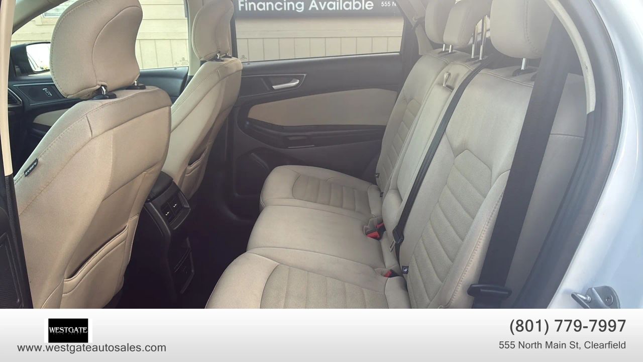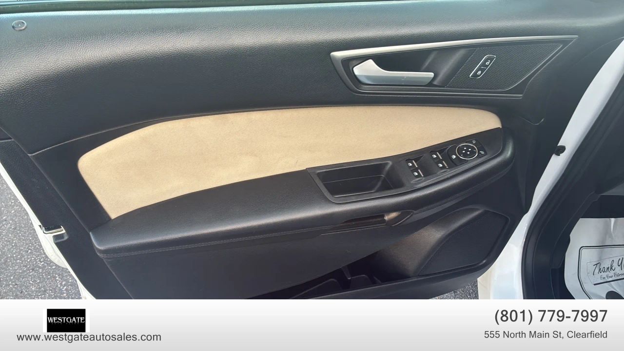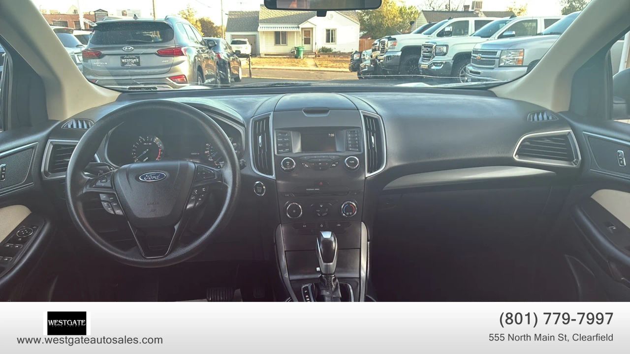 The exterior of this Ford Edge SE is defined by its clean lines, 18-inch painted aluminum wheels, and bright painted grille. Practicality meets style with integrated blind spot mirrors, power mirrors, and privacy glass. The vehicle also features auto halogen headlamps and wiper-activated headlamps for improved visibility during inclement weather. For added convenience, the easy fuel capless filler and LED taillamps highlight the modern design elements Ford integrated into this model year. This SUV is built for durability and long-term utility, backed by a history of safety that includes a 5-star overall government safety rating.