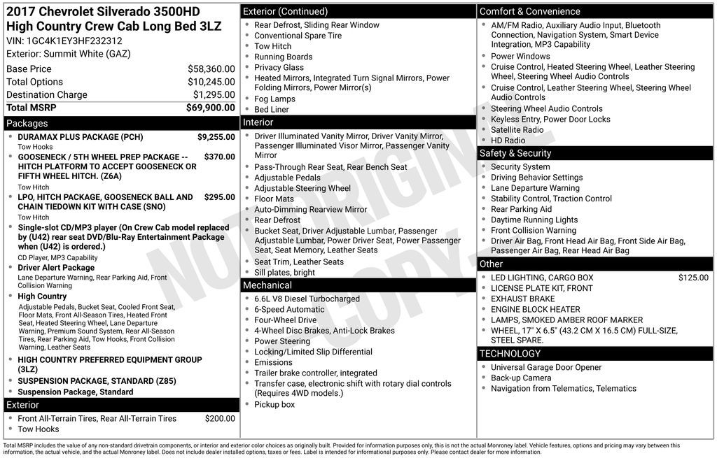 Summit White 2017 Chevrolet Silverado 3500HD High Country 4WD Allison 1000 6-Speed Automatic Duramax 6.6L V8 Turbodiesel Allison 1000 6-Speed Automatic, 4WD, Jet Black Medium Ash Gray Piping Stitching Leather.