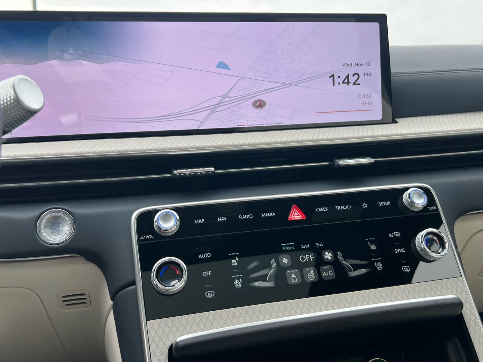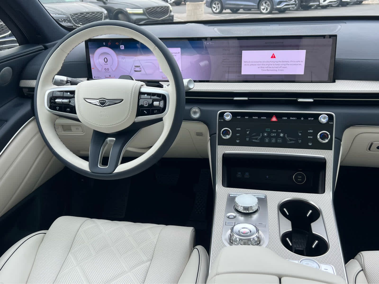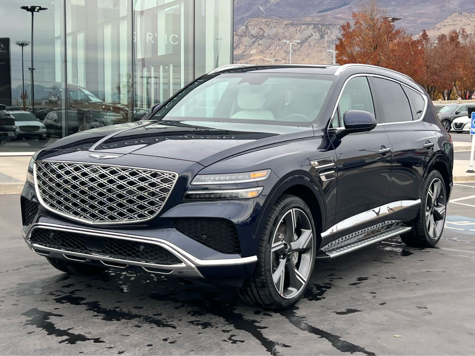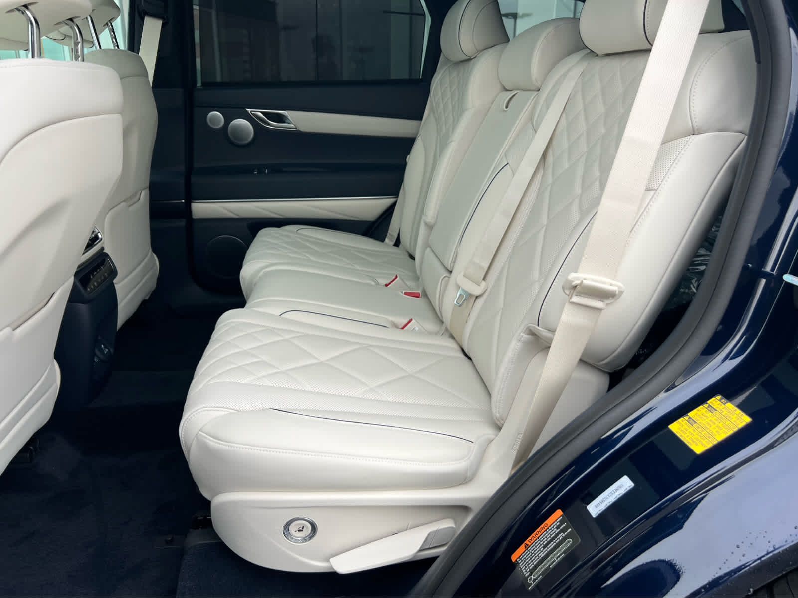 Leather Seats, Third Row Seat, Navigation, All Wheel Drive, Power Liftgate, Rear Air, Heated Driver Seat, Heated Rear Seat Rear Spoiler, MP3 Player, Keyless Entry, Privacy Glass. Genesis Prestige with Capri Blue exterior and Glacier White/Blue interior features a V6 Cylinder Engine with 375 HP at 5800 RPM*.