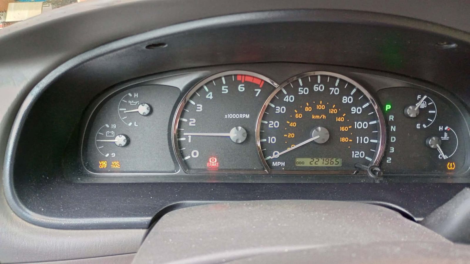 Brake light on, but no issues with brakes, likely a sensor. TMP lights on, and typical VSC and VSC TRAC lights on
