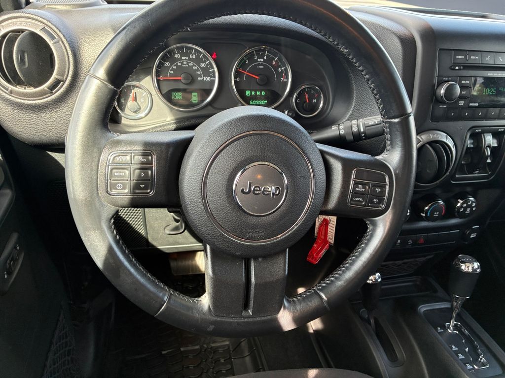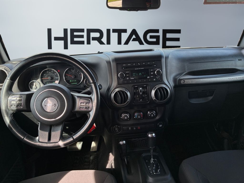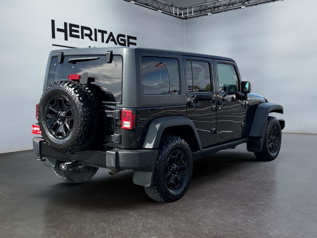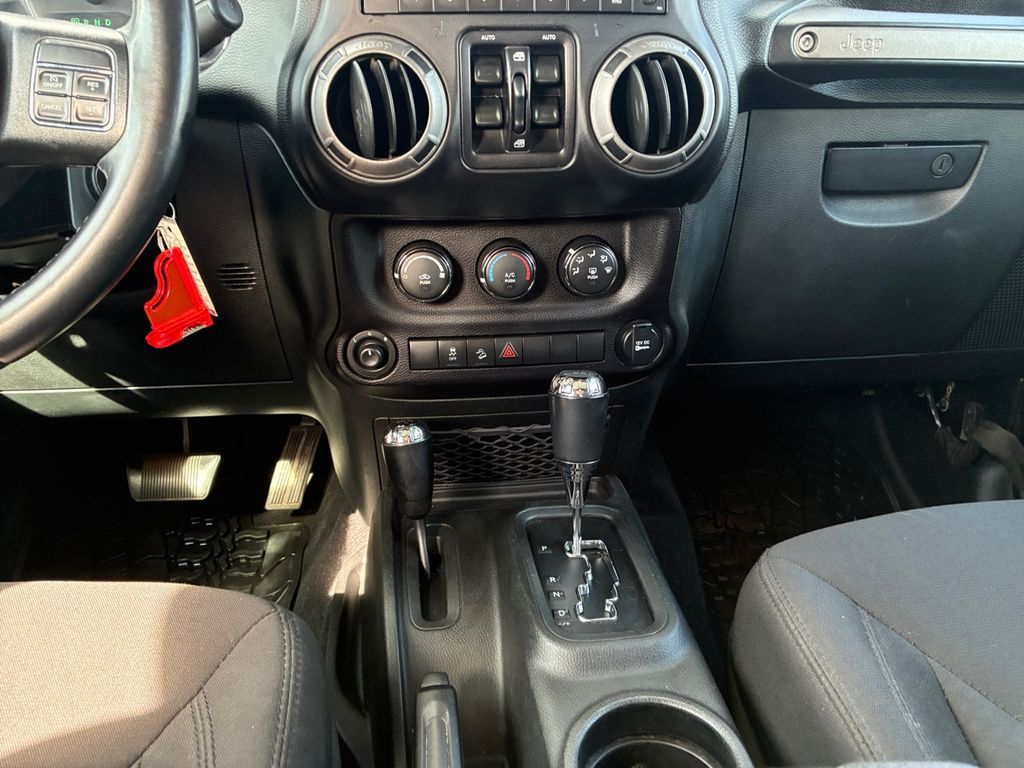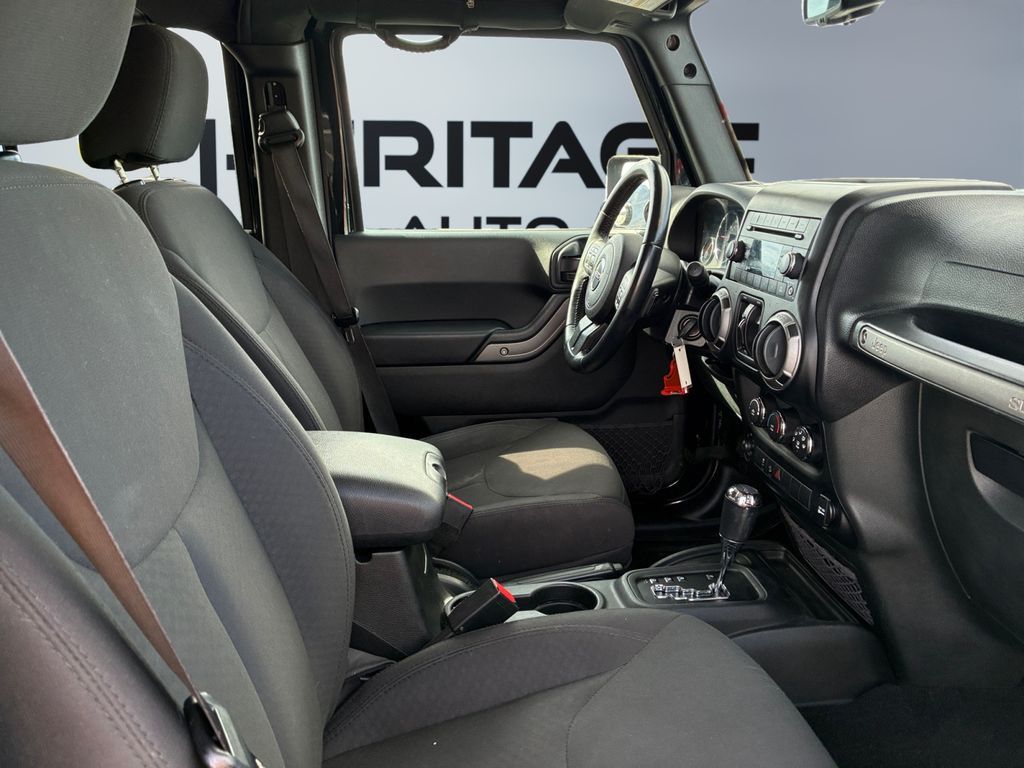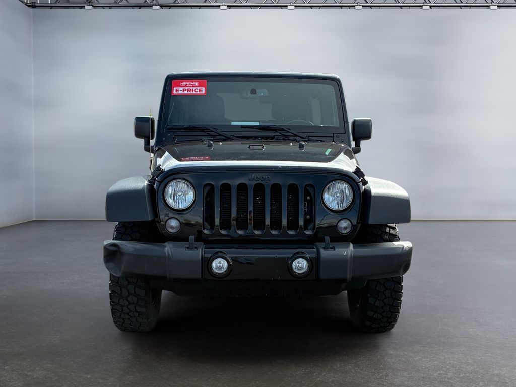 Power Convenience Group: Auto-Dimming Rearview Mirror with Lamp; Front 1-Touch Down Power Windows; Power Heated Exterior Mirrors; Security Alarm; Power Locks; Remote Keyless Entry,Quick Order Package 23W Willys Wheeler: Rear Passenger Assist Handles; Willys Wheeler Package; Black Jeep Grille Badge; SiriusXM Satellite Radio; Deep Tint Sunscreen Windows; 4-Wheel Drive Swing Gate Decal; Gloss Black Willys Grille; MOPAR Slush Mats; Low-Gloss Black Wrangler Decal; Willys Hood Decal; Rock Rails; Performance Suspension; Anti-Spin Differential Rear Axle; LT255/75R17C BSW Off-Road Tires; Jeep Trail Rated Kit; 17" X 7.5" High-Gloss Black Willys Wheels; 3.73 Rear Axle Ratio,Connectivity Group: Bright Leather-Wrapped Shift Knob; Electronic Vehicle Information Centre; Leather-Wrapped Steering Wheel; Hands-Free Communication with Bluetooth; Tire Pressure Monitoring System,Uconnect Phone handsfree wireless device connectivity,Cloth front seat upholstery,Driver seat with 6-way directional controls,Front passenger seat with 4-way directional controls,3.5 inch primary display,Brake assist system,Cruise control with steering wheel mounted controls,Sunrider manual convertible roof,Command-Trac part-time 4WD,Pentastar 3.6L V-6 DOHC, variable valve control, regular unleaded, engine with 285HP,Pentastar 3.6L V-6 DOHC,Mechanical,Sentry Key immobilizer,Trailer sway control,Electronic stability control system with anti-roll,Hill start assist,Front fog lights,Leather steering wheel,Manual rear child safety door locks,Illuminated front beverage holders,Heated driver and passenger side door mirrors,Manual tilting steering wheel,17 x 7.5-inch front and rear black aluminum wheels,LT255/75SR17 AT BSW 650 RPM front and rear tires,2 airbags,Driver front impact airbag,Passenger front impact airbag,Airbag occupancy sensor,Auto-locking doors,6-speed manual,Cloth rear seat upholstery,Exterior temperature display,Manual,Reflector headlights,Halogen headlights,Daytime running lights,Bucket front seats,Front seat centre armrest,4-wheel disk brakes,4-wheel antilock (ABS) brakes,Split-bench rear seat,Fold forward rear seatback,60-40 folding rear seats,Retractable and removable soft top,Four-wheel drive,Security system,Quadra-Coil off-road ride suspension,Seating capacity: 5,All-in-one remote fob and ignition key,Fixed convertible roll-over protection