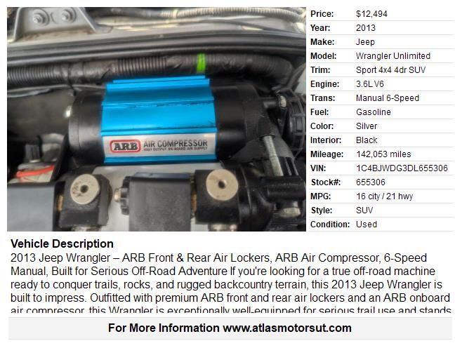 If you're looking for a true off-road machine ready to conquer trails, rocks, and rugged backcountry terrain, this 2013 Jeep Wrangler is built to impress. Outfitted with premium ARB front and rear air lockers and an ARB onboard air compressor, this Wrangler is exceptionally well-equipped for serious trail use and stands out as a top choice for Jeep enthusiasts who demand real capability.