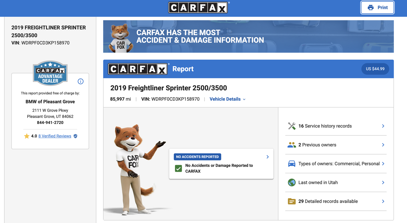Well cared for, properly serviced, and ready to go—this is an outstanding value in a Sprinter. Clean title, clean CarFax.