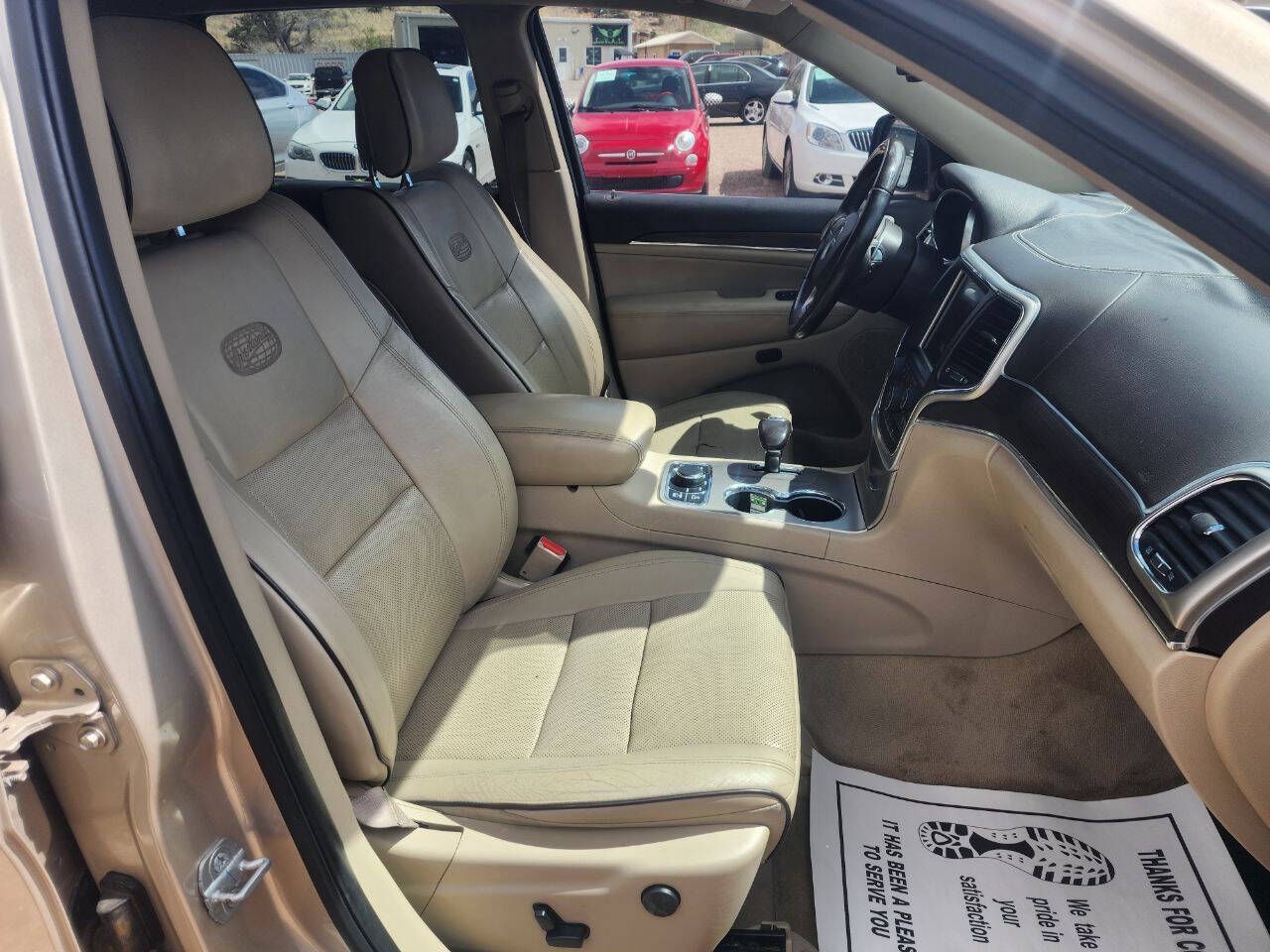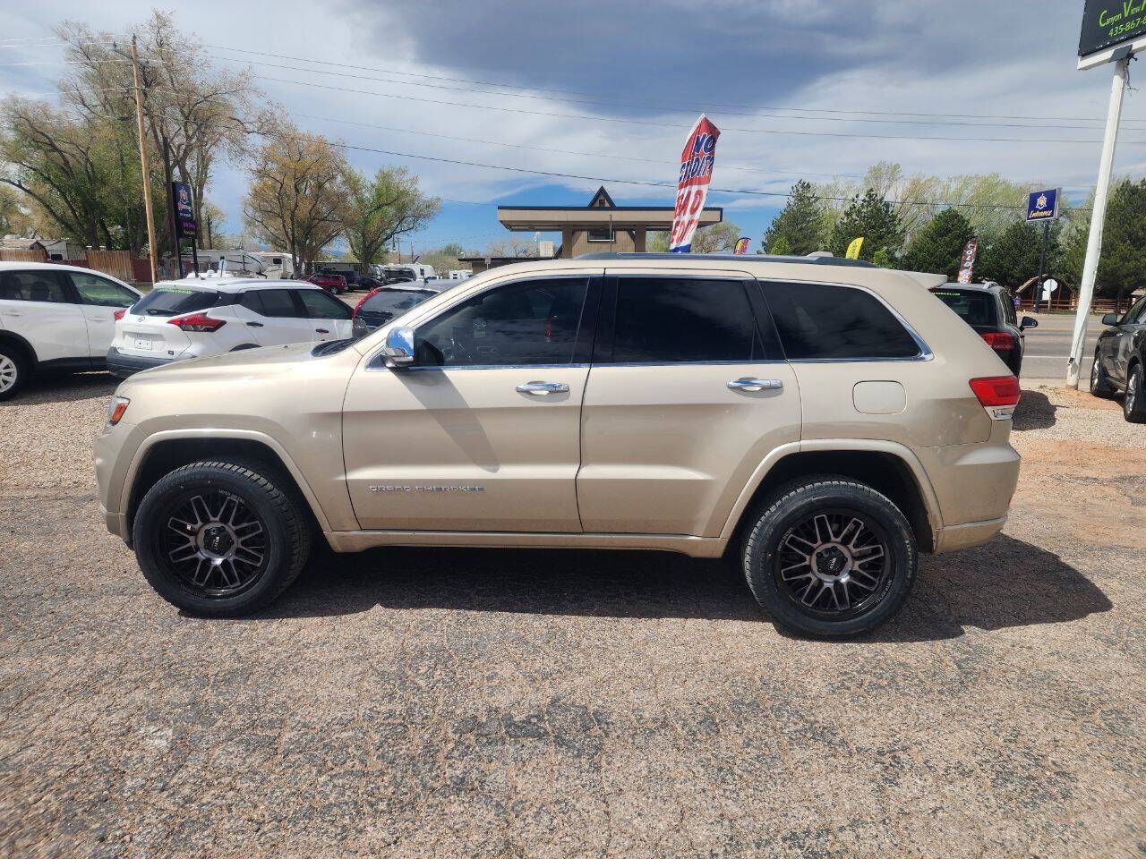 Check out this 2014 Jeep Grand Cherokee Overland 4x4, a perfect blend of luxury, performance, and off-road capability. It’s powered by the legendary HEMI V8 engine paired with a smooth 8-speed automatic transmission, giving you plenty of power whether you’re cruising on the highway or heading off the beaten path. The advanced 4x4 system includes multiple terrain modes like sand, snow, mud, and rock, so you can confidently handle just about any driving condition. This Jeep stands out with a great look, sitting on 20-inch Moto Metal wheels wrapped in brand new tires, giving it both style and added traction. Inside, the Overland trim offers a premium driving experience with a comfortable leather interior, heated and cooled front seats, and a heated steering wheel that makes cold mornings much more enjoyable. The panoramic sunroof brings in tons of natural light and adds to the open feel of the cabin, while the built-in navigation system helps keep you on track wherever you’re headed. Dual-zone climate control allows both driver and passenger to stay comfortable on every trip. Whether you’re looking for a capable SUV for all seasons or something comfortable for daily driving and road trips, this Grand Cherokee delivers on all fronts. It’s clean, well-equipped, and ready for its next adventure. To see all of our inventory please visit www.canyonviewautosales.com we also accept trade-ins. For outside financing or cash deals we offer a 3 month 3k mile warranty on vehicles 20 years or newer and under 200k miles