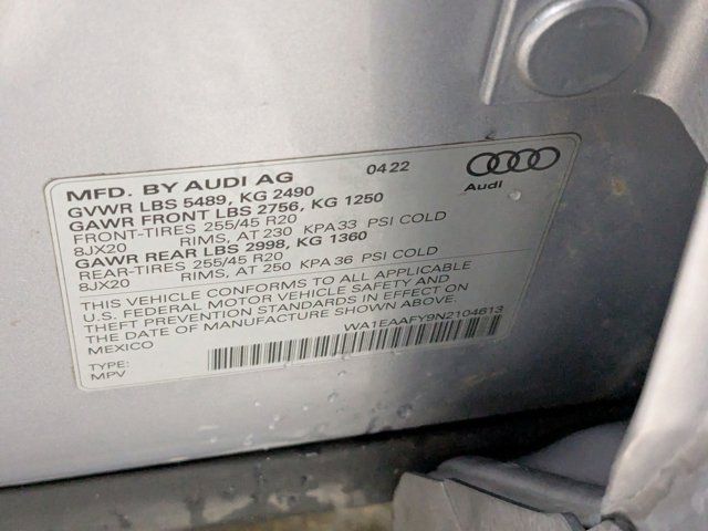 10 Speakers,AM/FM radio,Radio data system,Radio: Audi Sound System,Air Conditioning,Automatic temperature control,Front dual zone A/C,Rear air conditioning,Rear window defroster,Power driver seat,Power steering,Power windows,Remote keyless entry,Steering wheel mounted audio controls,Four wheel independent suspension,Speed-sensing steering,Traction control,4-Wheel Disc Brakes,ABS brakes,Dual front impact airbags,Dual front side impact airbags,Emergency communication system: Audi connect CARE,Front anti-roll bar,Low tire pressure warning,Occupant sensing airbag,Overhead airbag,Rear anti-roll bar,Power Liftgate,Brake assist,Electronic Stability Control,Exterior Parking Camera Rear,Auto High-beam Headlights,Delay-off headlights,Front fog lights,Rear fog lights,Panic alarm,Security system,Speed control,Bumpers: body-color,Heated door mirrors,Power door mirrors,Roof rack,Spoiler,Turn signal indicator mirrors,Auto-dimming Rear-View mirror,Compass,Driver door bin,Driver vanity mirror,Front reading lights,Garage door transmitter: HomeLink,Genuine wood console insert,Genuine wood dashboard insert,Genuine wood door panel insert,Heated 8-Way Power Front Bucket Seats,Illuminated entry,Leather Shift Knob,Outside temperature display,Overhead console,Passenger vanity mirror,Rear reading lights,Rear seat center armrest,Tachometer,Telescoping steering wheel,Tilt steering wheel,Trip computer,Front Bucket Seats,Front Center Armrest,Heated front seats,Leather Seating Surfaces,Power passenger seat,Split folding rear seat,Passenger door bin,Alloy wheels,Wheels: 18 5-Arm-Star Design,Rain sensing wipers,Rear window wiper,Speed-Sensitive Wipers,Variably intermittent wipers,5.302 Axle Ratio,Turbocharged,All Wheel Drive,Power Steering,ABS,4-Wheel Disc Brakes,Brake Assist,Lithium Ion Traction Battery,Tires - Front All-Season,Tires - Rear All-Season,Aluminum Wheels,Temporary Spare Tire,Sun/Moonroof,Generic Sun/Moonroof,Panoramic Roof,Heated Mirrors,Power Mirror(s),Integrated Turn Signal Mirrors,Rear Defrost,Privacy Glass,Intermittent Wipers,Variable Speed Intermittent Wipers,Rain Sensing Wipers,Rear Spoiler,Remote Trunk Release,Power Liftgate,Power Door Locks,Luggage Rack,Fog Lamps,Automatic Highbeams,Daytime Running Lights,Automatic Headlights,Headlights-Auto-Leveling,LED Headlights,AM/FM Stereo,MP3 Capability,Bluetooth Connection,Auxiliary Audio Input,HD Radio,Smart Device Integration,MP3 Capability,Steering Wheel Audio Controls,Bluetooth Connection,Power Driver Seat,Power Passenger Seat,Bucket Seats,Heated Front Seat(s),Driver Adjustable Lumbar,Pass-Through Rear Seat,Rear Bench Seat,Trip Computer,Power Windows,Leather Steering Wheel,Keyless Entry,Power Door Locks,Universal Garage Door Opener,Cruise Control,Climate Control,Multi-Zone A/C,A/C,A/C,Rear A/C,Woodgrain Interior Trim,Leather Seats,Auto-Dimming Rearview Mirror,Driver Vanity Mirror,Passenger Vanity Mirror,Driver Illuminated Vanity Mirror,Passenger Illuminated Visor Mirror,Floor Mats,Smart Device Integration,Power Windows,Power Door Locks,Trip Computer,Security System,Immobilizer,Traction Control,Stability Control,Traction Control,Front Side Air Bag,Telematics,Requires Subscription,Blind Spot Monitor,Cross-Traffic Alert,Rear Collision Mitigation,Front Collision Mitigation,Rear Parking Aid,Tire Pressure Monitor,Driver Air Bag,Passenger Air Bag,Front Head Air Bag,Rear Head Air Bag,Passenger Air Bag Sensor,Child Safety Locks