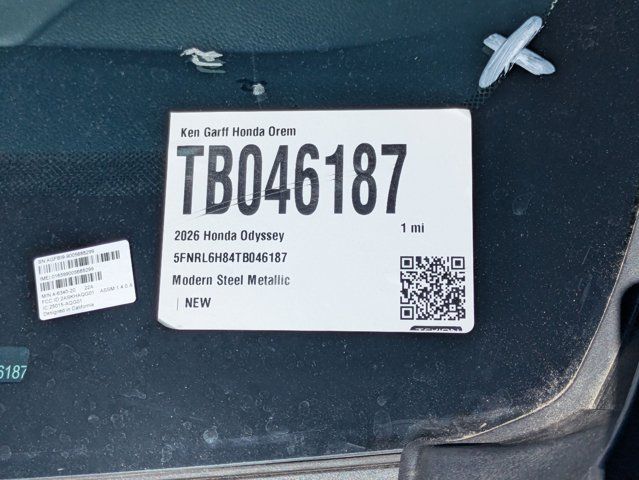 Ken Garff Honda is very proud to offer this fantastic-looking 2026 Honda Odyssey Touring in Modern Steel Metallic. FWD Touring 10-Speed Automatic3rd row seats: split-bench, 4-Wheel Disc Brakes, 7 Speakers, ABS brakes, Adaptive Cruise Control: Adaptive Cruise Control (ACC) with Low-Speed Follow, Air Conditioning, Alloy wheels, AM/FM radio: SiriusXM, Anti-whiplash front head restraints, Apple CarPlay/Android Auto, Auto High-beam Headlights, Auto-dimming Rear-View mirror, Automatic temperature control, Blind Spot Information (BSI) System warning, Brake assist, Bumpers: body-color, Compass, Delay-off headlights, Driver door bin, Driver vanity mirror, Driver's Seat Mounted Armrest, Dual front impact airbags, Dual front side impact airbags, Electronic Stability Control, Emergency communication system: HondaLink, Exterior Parking Camera Rear, Four wheel independent suspension, Front anti-roll bar, Front Bucket Seats, Front dual zone A/C, Front fog lights, Front reading lights, Fully automatic headlights, Garage door transmitter: HomeLink, Heated door mirrors, Heated Front Bucket Seats, Heated front seats, Illuminated entry, Knee airbag, Lane departure: Lane Keeping Assist System (LKAS) active, Leather steering wheel, Leather-Trimmed Seats with Piping, Low tire pressure warning, Memory seat, Navigation system: Honda Satellite-Linked Navigation System, Occupant sensing airbag, Outside temperature display, Overhead airbag, Overhead console, Panic alarm, Passenger door bin, Passenger seat mounted armrest, Passenger vanity mirror, Power door mirrors, Power driver seat, Power Liftgate, Power moonroof, Power passenger seat, Power steering, Power windows, Radio data system, Radio: 160-Watt AM/FM/HD/SiriusXM Audio System, Rear air conditioning, Rear anti-roll bar, Rear audio controls, Rear reading lights, Rear seat center armrest, Rear window defroster, Rear window wiper, Reclining 3rd row seat, Remote keyless entry, Security system, Speed control, Speed-sensing steering, Speed-Sensitive Wipers, Split folding rear seat, Spoiler, Steering wheel mounted audio controls, Tachometer, Telescoping steering wheel, Tilt steering wheel, Traction control, Trip computer, Turn signal indicator mirrors, Variably intermittent wipers, Wheels: 19 Gray Alloy.19/28 City/Highway MPG Fuel Economy estimates are based on EPA mileage ratings. Actual mileage will vary depending on driving conditions, habits, vehicle maintenance, and other factors. Advertised Prices do not include any dealer installed options and advertised prices exclude leases.