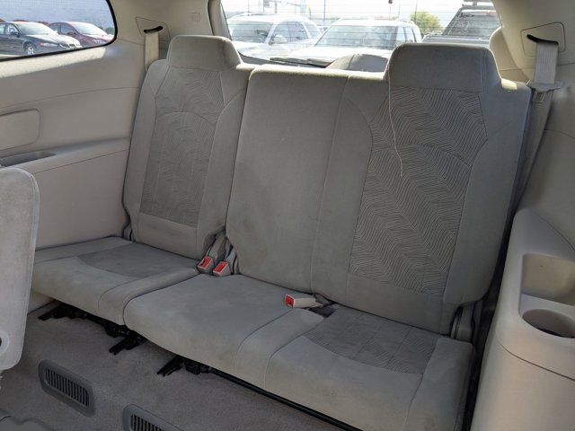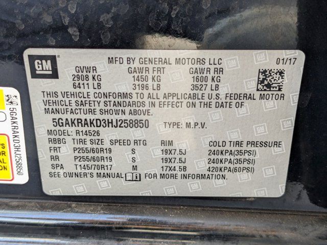 EBONY TWILIGHT METALLIC,LICENSE PLATE BRACKET FRONT MOUNTING PACKAGE,TRANSMISSION 6- SPEED AUTOMATIC ELECTRONICALLY CONTROLLED WITH OVERDRIVE (STD),LIGHT TITANIUM CLOTH SEAT TRIM with Dark Titanium interior accents,SEATING 7-PASSENGER FRONT BUCKET second-row captain's chairs flat folding and SmartSlide access to third row third row flat folding 60/40 split bench (STD),ENGINE 3.6L VARIABLE VALVE TIMING V6 WITH SIDI (SPARK IGNITION DIRECT INJECTION) DOHC (288 hp [214.7 kW] @ 6300 rpm 270 lb-ft of torque [364.5 N-m] @ 3400 rpm) (STD),AUDIO SYSTEM COLOR TOUCH RADIO WITH INTELLILINK AM/FM/SIRIUSXM RADIO WITH CD PLAYER 6.5 diagonal touch-screen display USB port and auxiliary input jack (STD),CONVENIENCE PREFERRED EQUIPMENT GROUP Includes Standard Equipment,Front Wheel Drive,Power Steering,Aluminum Wheels,Tires - Front All-Season,Tires - Rear All-Season,Temporary Spare Tire,HID headlights,Automatic Headlights,Privacy Glass,Heated Mirrors,Power Mirror(s),Integrated Turn Signal Mirrors,Intermittent Wipers,Intermittent Wipers,Remote Trunk Release,Power Liftgate,AM/FM Stereo,CD Player,Satellite Radio,MP3 Capability,Bluetooth Connection,Auxiliary Audio Input,Requires Subscription,MP3 Capability,Bluetooth Connection,Auxiliary Audio Input,MP3 Capability,Auxiliary Audio Input,MP3 Capability,Auxiliary Audio Input,3rd Row Seat,Bucket Seats,Rear Bucket Seats,Power Driver Seat,Driver Adjustable Lumbar,Power Passenger Seat,Floor Mats,Adjustable Steering Wheel,Leather Steering Wheel,Cruise Control,Steering Wheel Audio Controls,Power Windows,Power Door Locks,Universal Garage Door Opener,Cruise Control,Keyless Entry,Power Door Locks,Remote Engine Start,Security System,Immobilizer,Climate Control,Multi-Zone A/C,A/C,Rear A/C,Rear Defrost,Auto-Dimming Rearview Mirror,Driver Vanity Mirror,Passenger Vanity Mirror,Driver Illuminated Vanity Mirror,Passenger Illuminated Visor Mirror,ABS,4-Wheel Disc Brakes,Traction Control,Traction Control,Stability Control,Daytime Running Lights,Automatic Headlights,Driver Air Bag,Passenger Air Bag,Front Side Air Bag,Front Head Air Bag,Rear Head Air Bag,Passenger Air Bag Sensor,Passenger Air Bag Sensor,Telematics,Navigation from Telematics,Requires Subscription,Telematics,WiFi Hotspot,Requires Subscription,Rear Parking Aid,MP3 Capability,Bluetooth Connection,Back-Up Camera,Auxiliary Audio Input,Child Safety Locks,Tire Pressure Monitor