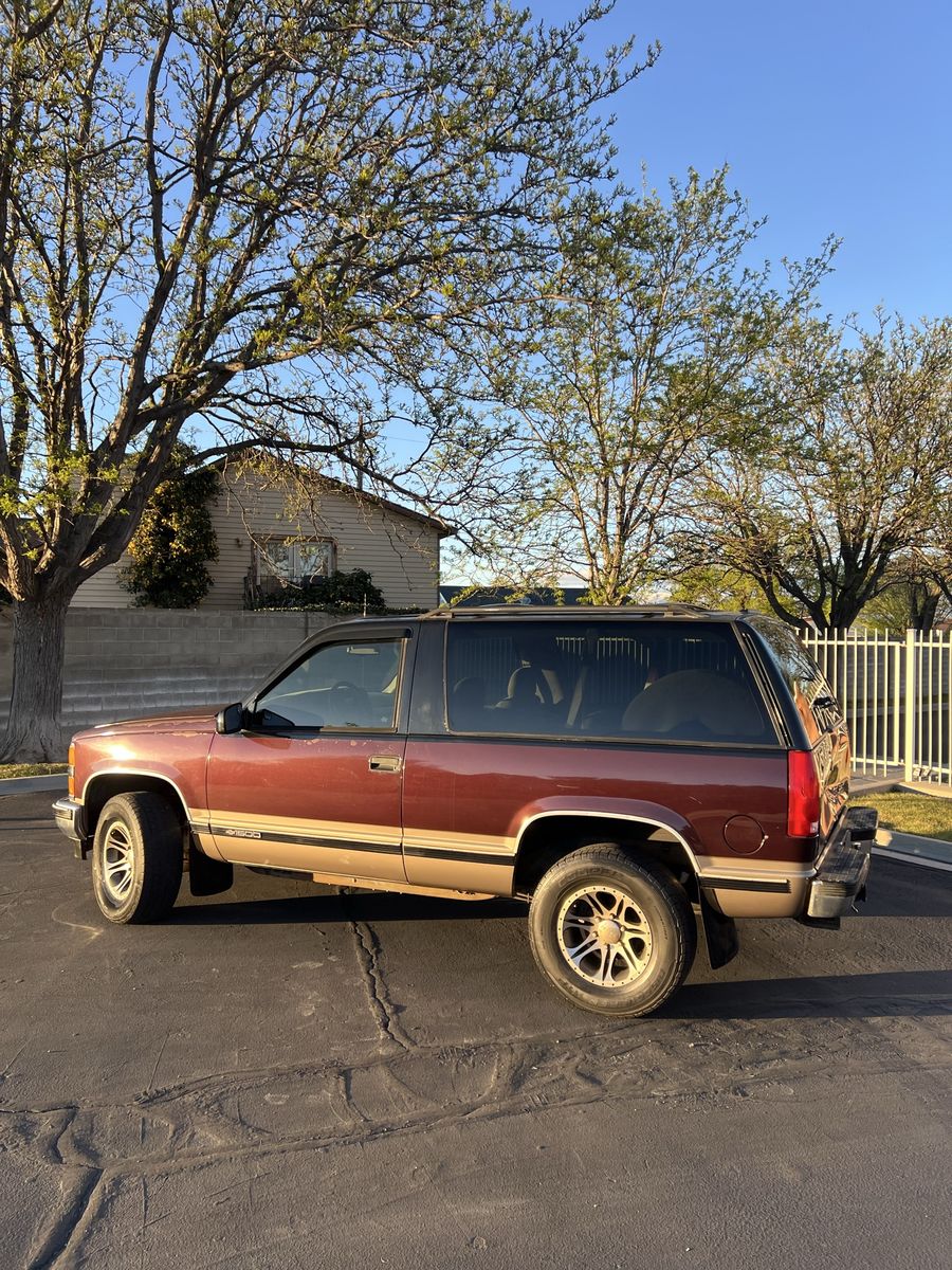 Runs and drives good ! A/c works great ! These 2 door tahoes are getting hard to find in good shape this one came from AZ and is rust free ! It’s in good shape besides the dented tail gate but I have another one to go with it already, interior is pretty nice shape but needs a headliner redone 5.7 vortex runs great trans looks like it’s been rebuilt in the past shifts good asking $4,900 obo clean title in hand call or text 8017081159