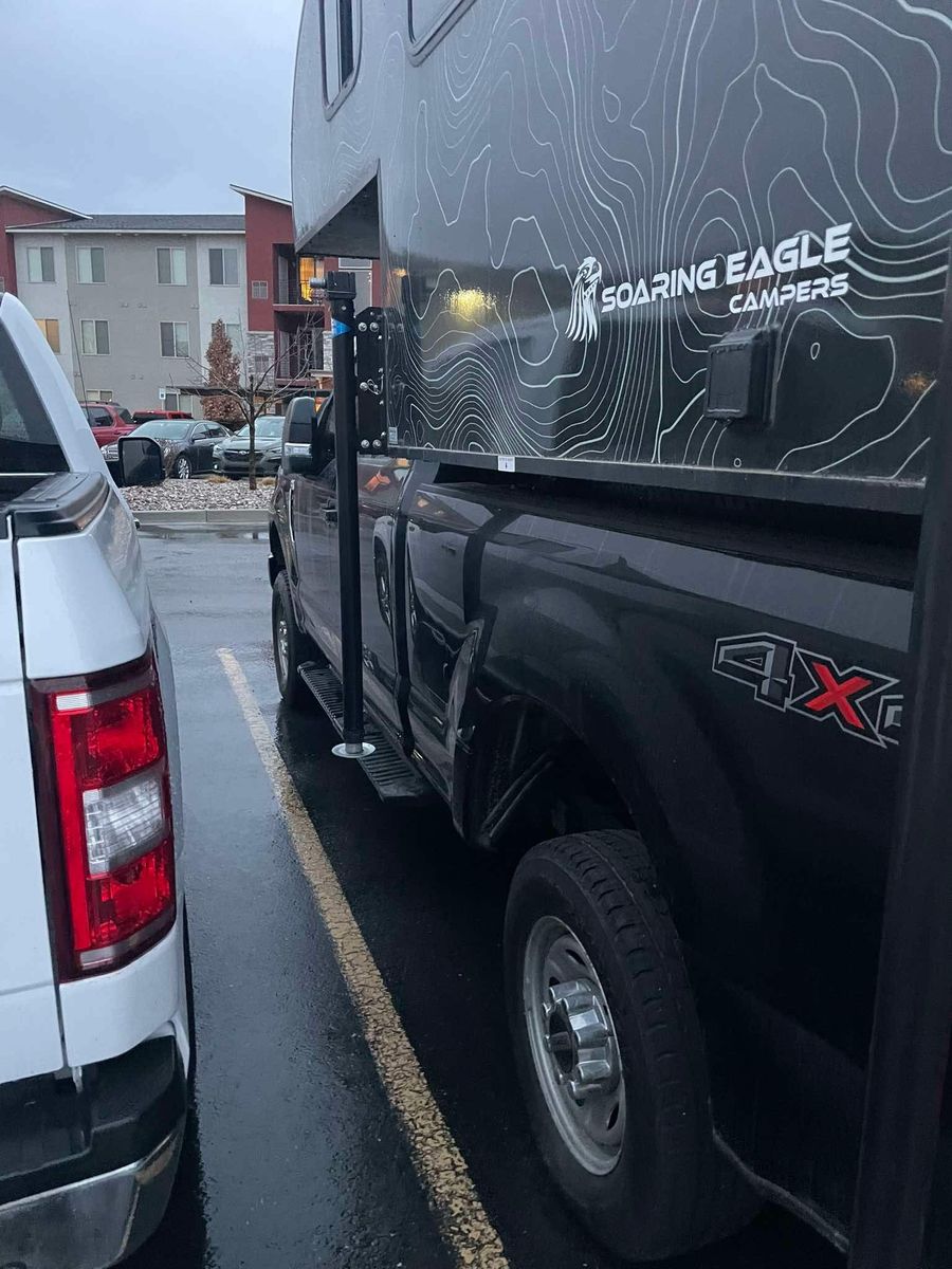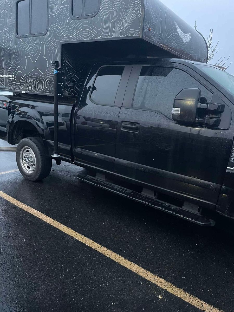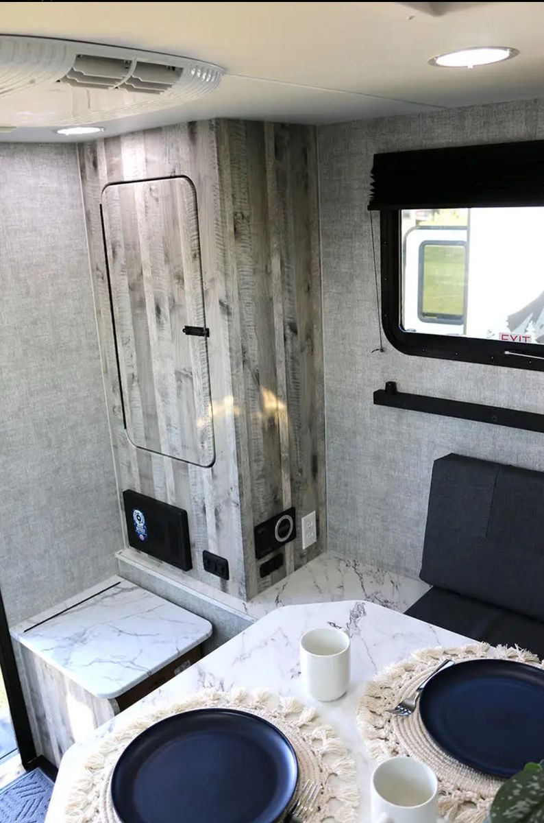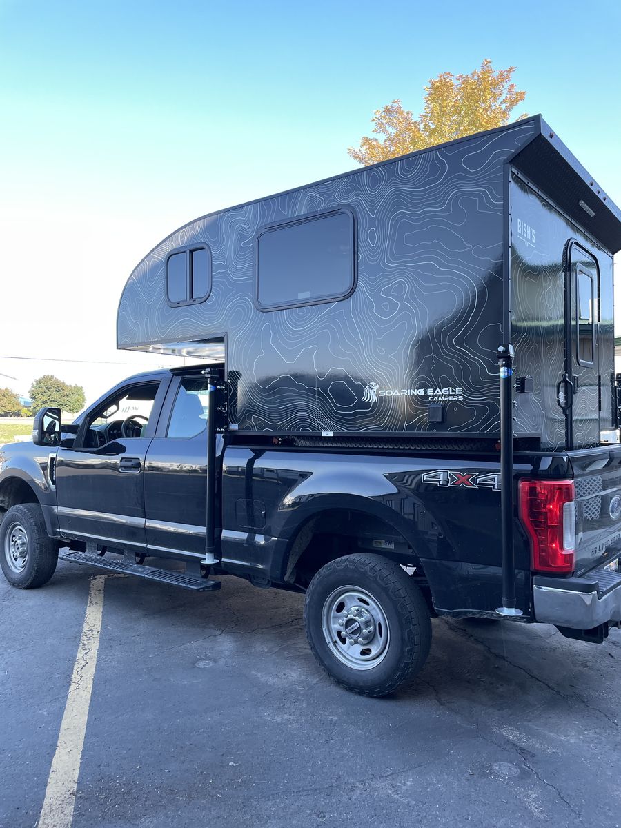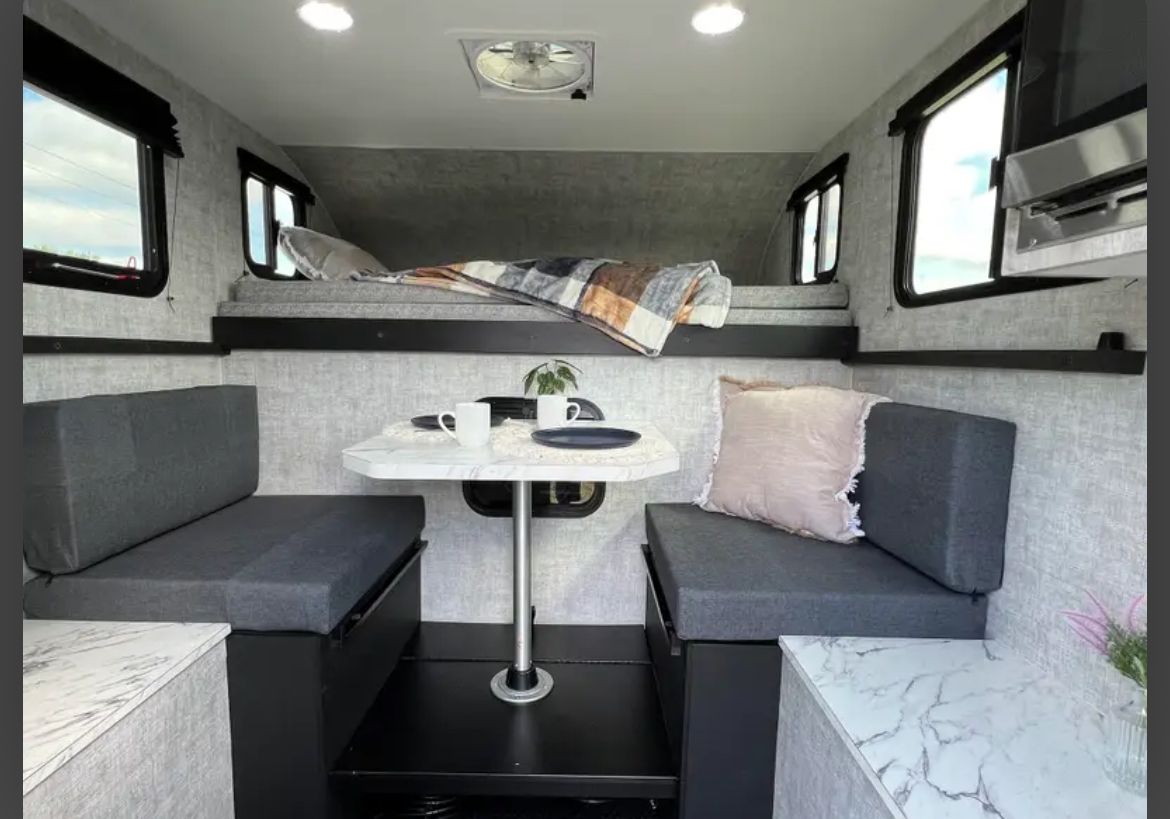Camper is 2023 Soaring Eagle Adlar 6.5 XL. Great condition, bare bones, no solar (option to plug in available), composting toilet that's still in the box/never been used, has plugins for electricity, overhead ventilation, no kitchen, no shower, top bed slides out to fit a king size bed mattress, table & bench folds down to form another bed, has microwave for when you're not dry camping, four windows, dry weight is 1,100 lbs, rear LED porch light and optional floodlights.