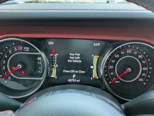 TRAILER TOW PACKAGE -inc: Trailer Hitch Zoom Class IV Receiver Hitch Heavy Duty Engine Cooling 240 Amp Alternator,QUICK ORDER PACKAGE 24R -inc: Engine: 3.6L V6 24V VVT UPG I w/ESS Transmission: 8-Speed Automatic (850RE),BLACK LEATHER TRIMMED BUCKET SEATS -inc: #1 Seat Foam Cushion Leather Wrapped Shift Knob Premium Door Trim Panel Full Length Floor Console Premium Armrest Leather Wrapped Park Brake Handle Rear Armrest w/Cupholder Seat,COLD WEATHER GROUP -inc: Heated Steering Wheel Heated Front Seats,BLACK CLEARCOAT,MOPAR HARDTOP HEADLINER,TIRES: LT285/70R17C BSW A/T (STD),ENGINE: 3.6L V6 24V VVT UPG I W/ESS (STD),MOPAR ALL-WEATHER SLUSH MATS,BLACK 3-PIECE HARD TOP -inc: Freedom Panel Storage Bag Rear Window Defroster Rear Sliding Window,WHEELS: 17 X 7.5 GRANITE CRYSTAL ALUMINUM (STD),REMOTE START SYSTEM,TRANSMISSION: 8-SPEED AUTOMATIC (850RE) -inc: Transmission Skid Plate Selec-Speed Control,MOPAR SPRAY IN BEDLINER,4.10 REAR AXLE RATIO (STD),FRONT LICENSE PLATE BRACKET,Four Wheel Drive,Locking/Limited Slip Differential,Locking/Limited Slip Differential,Power Steering,ABS,4-Wheel Disc Brakes,Brake Assist,Locking/Limited Slip Differential,Brake Actuated Limited Slip Differential,Aluminum Wheels,Tires - Front All-Terrain,Tires - Rear All-Terrain,Conventional Spare Tire,Tow Hooks,Tow Hooks,Heated Mirrors,Power Mirror(s),Privacy Glass,Intermittent Wipers,Variable Speed Intermittent Wipers,Rollover Protection Bars,Convertible Soft Top,Power Door Locks,Daytime Running Lights,Automatic Headlights,Fog Lamps,AM/FM Stereo,Navigation System,Satellite Radio,Bluetooth Connection,HD Radio,Requires Subscription,Premium Sound System,MP3 Capability,Steering Wheel Audio Controls,Auxiliary Audio Input,Premium Sound System,Bluetooth Connection,Driver Adjustable Lumbar,Driver Adjustable Lumbar,Pass-Through Rear Seat,Rear Bench Seat,Adjustable Steering Wheel,Trip Computer,Power Windows,Leather Steering Wheel,Keyless Entry,Power Door Locks,Keyless Start,Keyless Entry,Power Door Locks,Universal Garage Door Opener,Cruise Control,Climate Control,Multi-Zone A/C,A/C,Bucket Seats,Auto-Dimming Rearview Mirror,Driver Vanity Mirror,Passenger Vanity Mirror,Driver Illuminated Vanity Mirror,Passenger Illuminated Visor Mirror,Floor Mats,Navigation System,Smart Device Integration,Power Windows,Power Door Locks,Trip Computer,Security System,Immobilizer,Traction Control,Stability Control,Traction Control,Front Side Air Bag,Telematics,Requires Subscription,Tire Pressure Monitor,Driver Air Bag,Passenger Air Bag,Passenger Air Bag Sensor,Child Safety Locks,Back-Up Camera