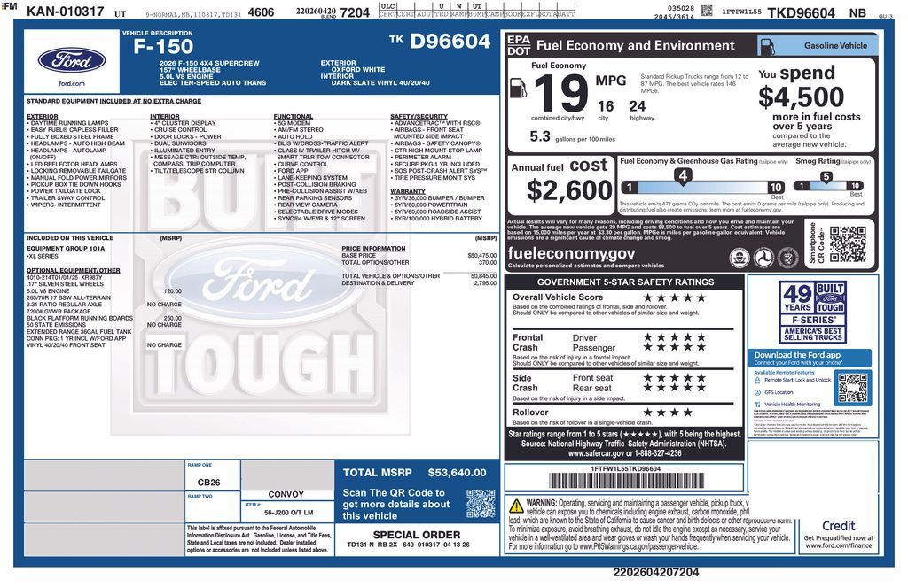 2026 Ford F-150 XL Oxford White 4WD 10-Speed Automatic 5.0L V8 4WD. Price includes: $500 - Retail Customer Cash