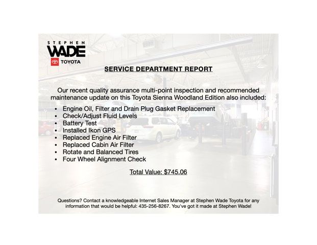 ONE OWNER CLEAN CARFAX. 2025 Toyota Sienna XLE AWD WOODLAND EDITION in Cement with Black SofTex. 2.5L 4-Cylinder Hybrid Engine, eCVT, Electronic On-Demand All-Wheel Drive.34/36 City/Highway MPG.CALL STEPHEN WADE TOYOTA: 435-241-3828.Woodland Edition.Rear Seat Entertainment System: 1080p HD Entertainment Center with 11.6-Inch Display, HDMI Input, Remote and Two Wireless Headphones.SiriusXM Capability.Mudguards.SERVICE REPORT: At Stephen Wade Toyota, we do more to insure we offer the most mechanically sound pre-owned vehicles with maintenance that is up to date. Our recent quality assurance multi-point inspection and recommended maintenance update on this Sienna Woodland Edition also included an engine oil, filter and drain plug gasket replacement, check/adjust fluid levels, battery test, installed Ikon GPS, replaced engine air filter, replaced cabin air filter, rotate and balanced tires and a four wheel alignment check - a $745.06 value.MARKET REPORT: We use advanced software to shop the automotive marketplace nationwide everyday. This allows us to competitively offer you the best value one can find anywhere. Contact our knowledgeable Internet sales managers; Danny, Jessica or Wesley at Stephen Wade Toyota for a priority test drive, or for any information that would be helpful: 435-241-3828. You've got it made at Stephen Wade!