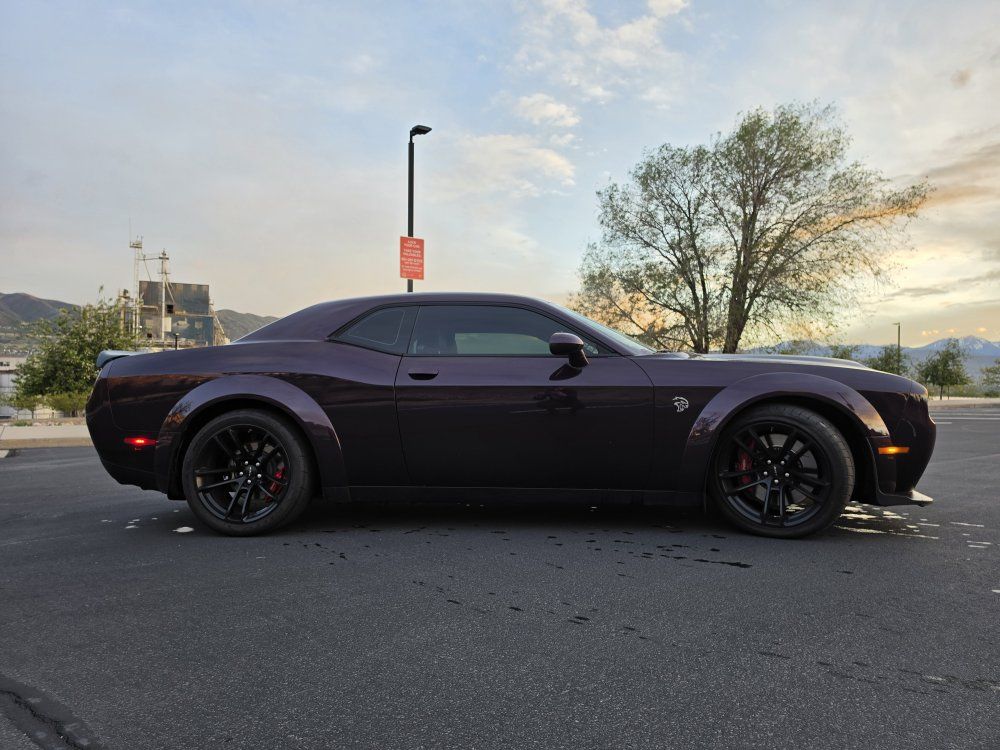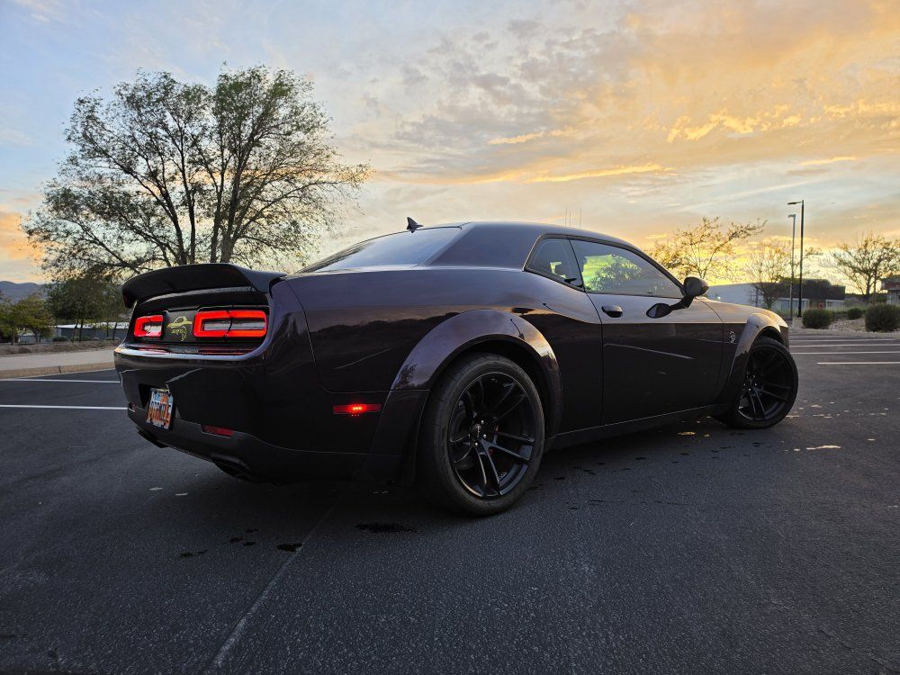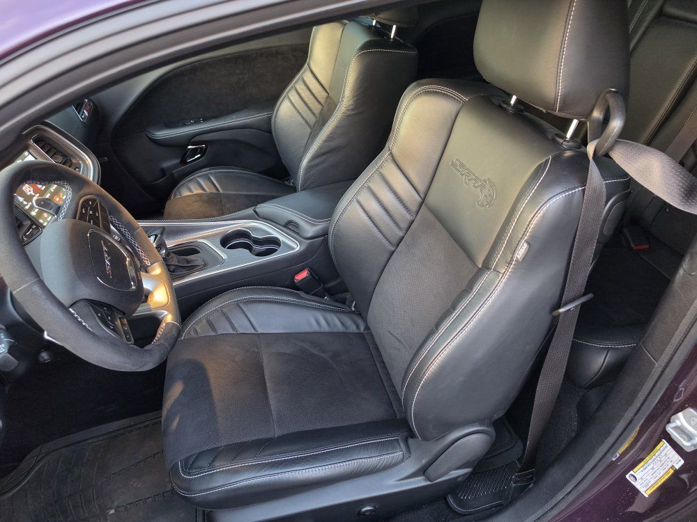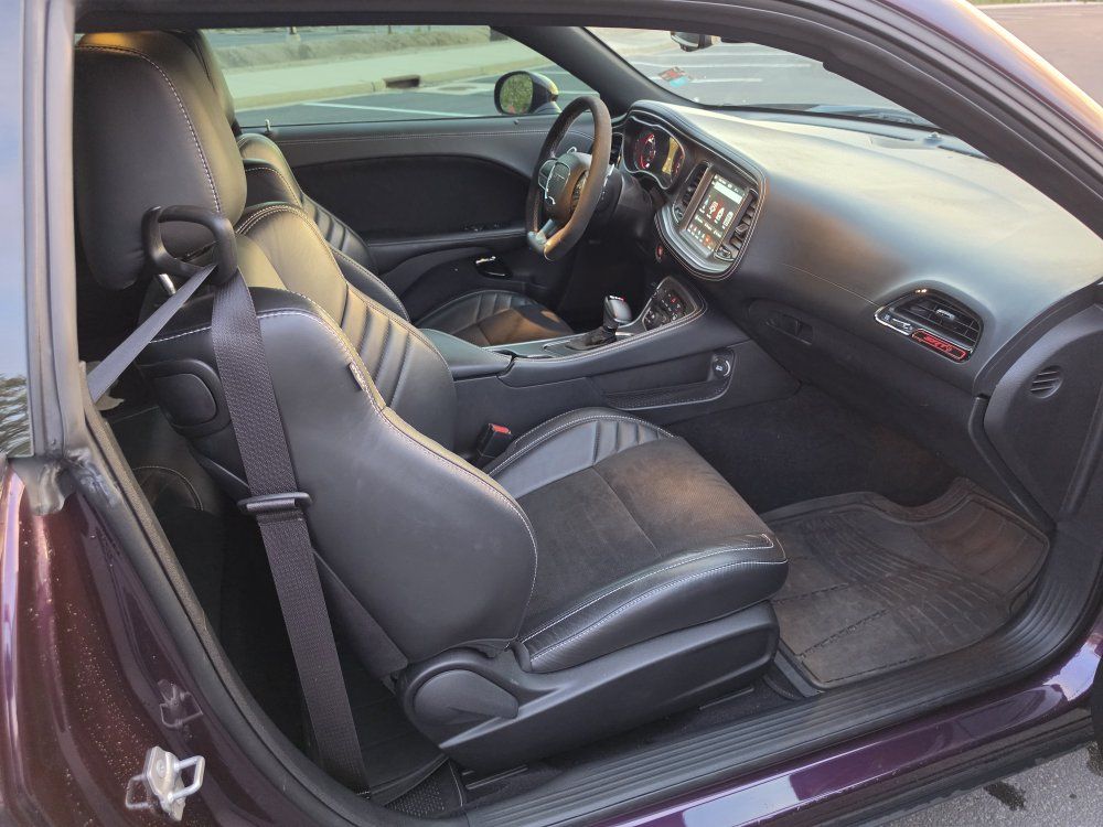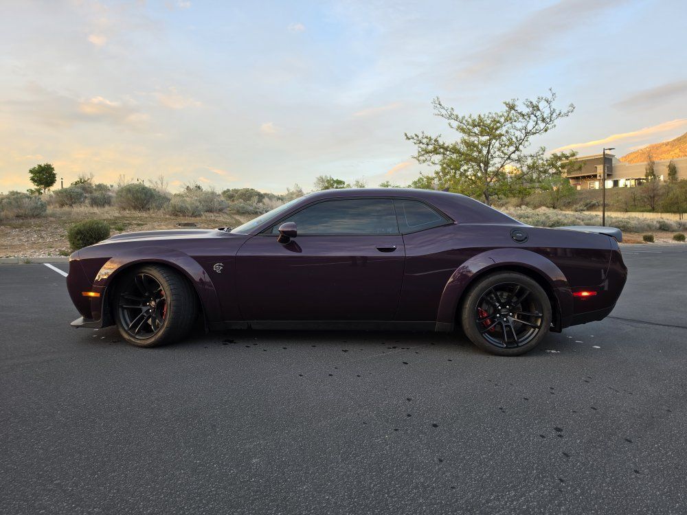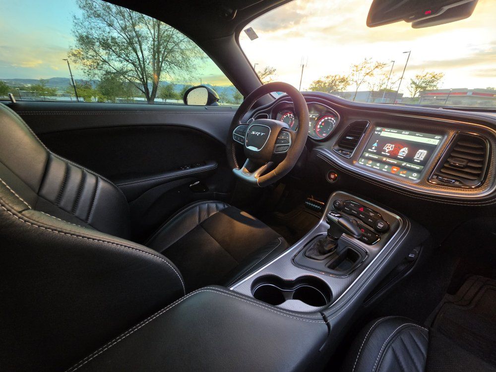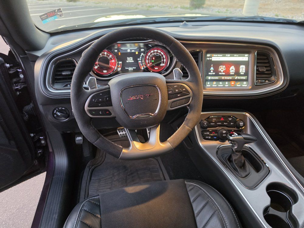 Powered by a 6.2L supercharged HEMI V8 (717 hp) paired to an 8-speed automatic transmission. Original MSRP was $78,560. Performance & Features: 717 HP / 656 lb-ft supercharged V8; 8-speed automatic transmission; Widebody competition suspension Adaptive damping suspension; Brembo 6-piston front brakes; Launch control line lock; Active exhaust system; SRT Performance Pages; Factory Widebody Package: Widebody fender flares; 20x11” Carbon Black wheels; 305-width tires: Upgraded suspension tuning; Interior & Comfort (Loaded): Alcantara / Laguna leather seats; Heated & ventilated front seats; Heated steering wheel; Premium stitched dash & door panels; Power tilt/telescope steering wheel; Uconnect 8.4” touchscreen with Navigation; Apple CarPlay & Android Auto; SiriusXM WiFi hotspot; Driver Convenience: Blind-spot monitoring; Rear cross-path detection; HID headlamps; Backup camera parking sensors;