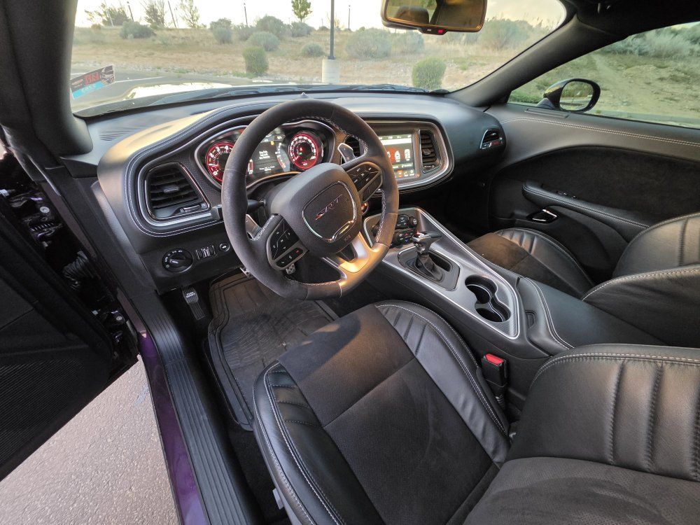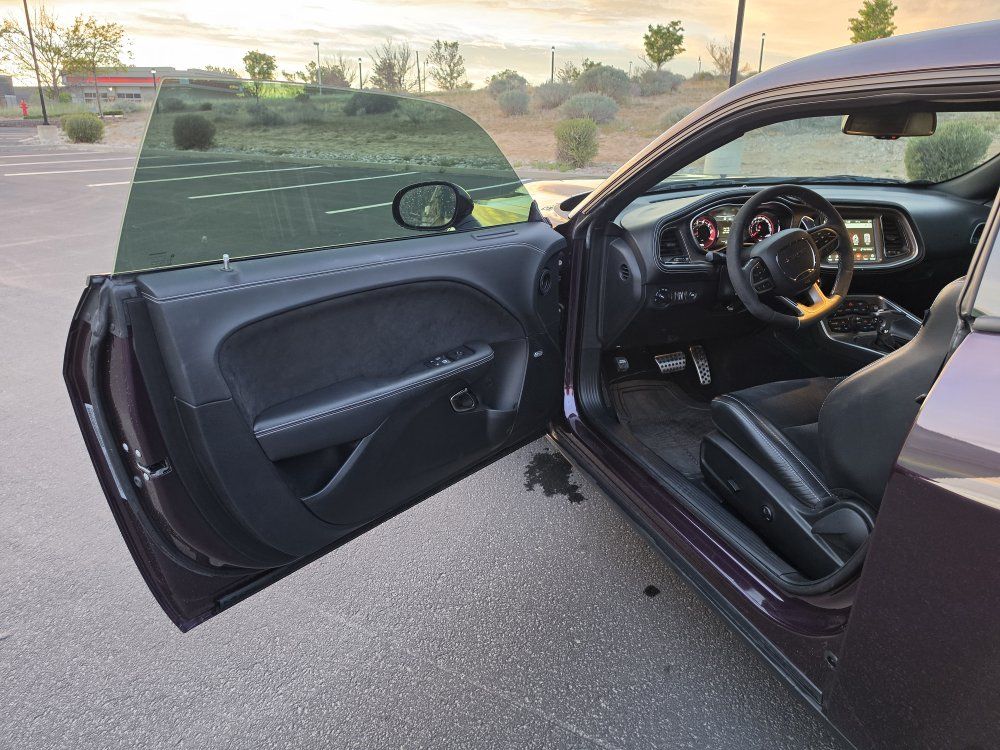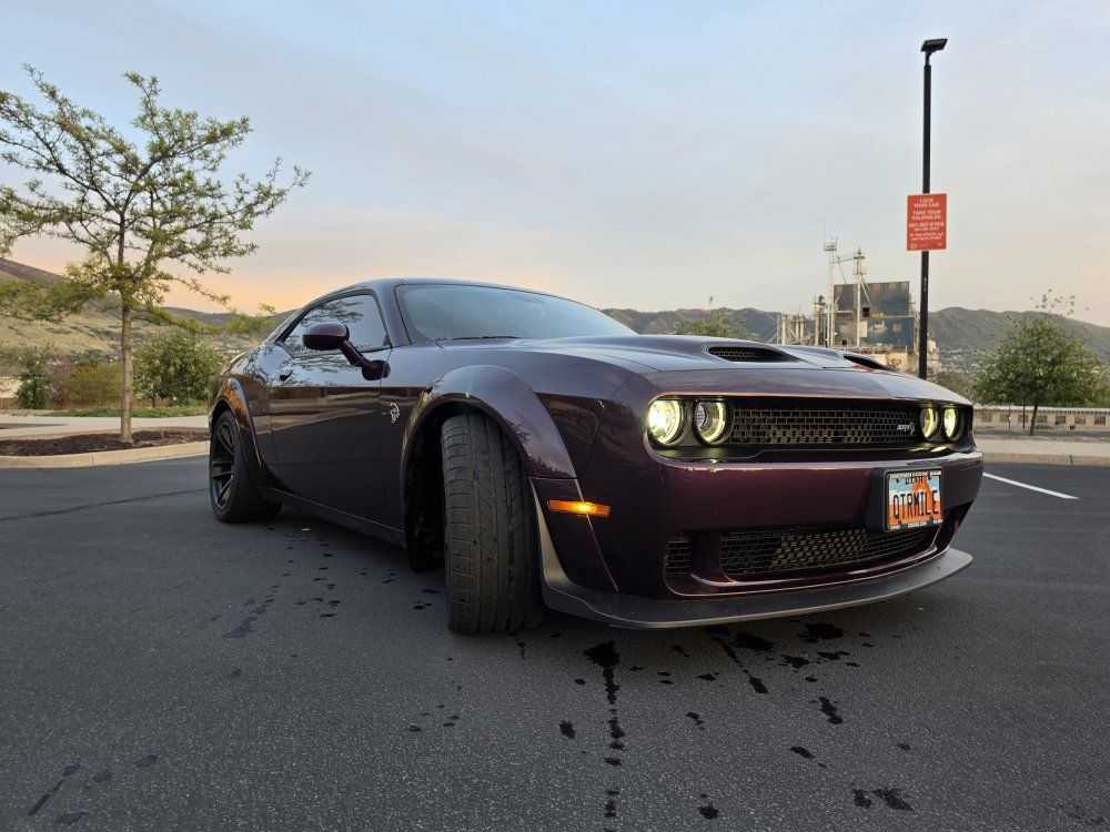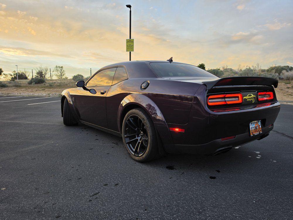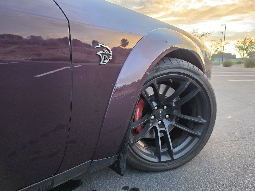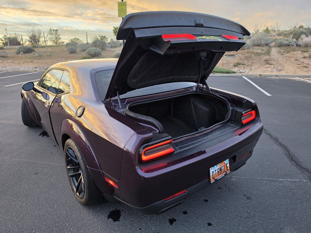 Powered by a 6.2L supercharged HEMI V8 (717 hp) paired to an 8-speed automatic transmission. Original MSRP was $78,560. Performance & Features: 717 HP / 656 lb-ft supercharged V8; 8-speed automatic transmission; Widebody competition suspension Adaptive damping suspension; Brembo 6-piston front brakes; Launch control line lock; Active exhaust system; SRT Performance Pages; Factory Widebody Package: Widebody fender flares; 20x11” Carbon Black wheels; 305-width tires: Upgraded suspension tuning; Interior & Comfort (Loaded): Alcantara / Laguna leather seats; Heated & ventilated front seats; Heated steering wheel; Premium stitched dash & door panels; Power tilt/telescope steering wheel; Uconnect 8.4” touchscreen with Navigation; Apple CarPlay & Android Auto; SiriusXM WiFi hotspot; Driver Convenience: Blind-spot monitoring; Rear cross-path detection; HID headlamps; Backup camera parking sensors;