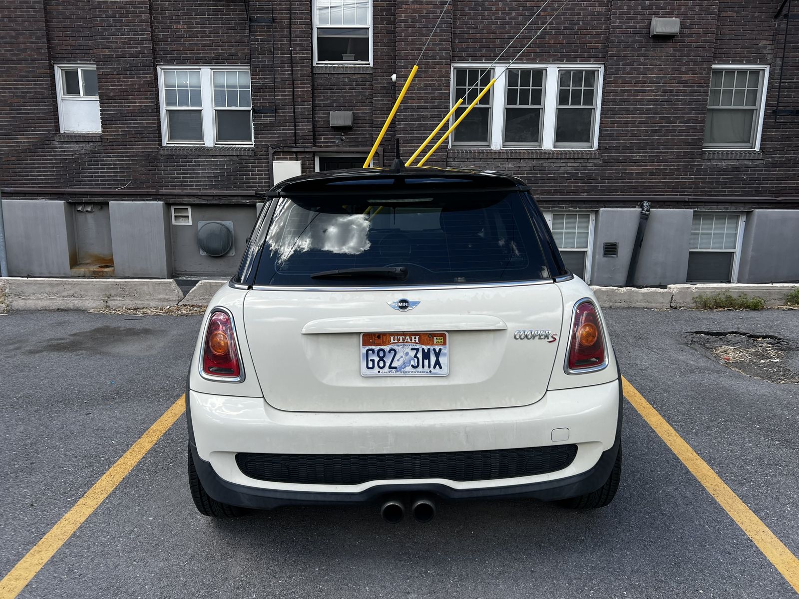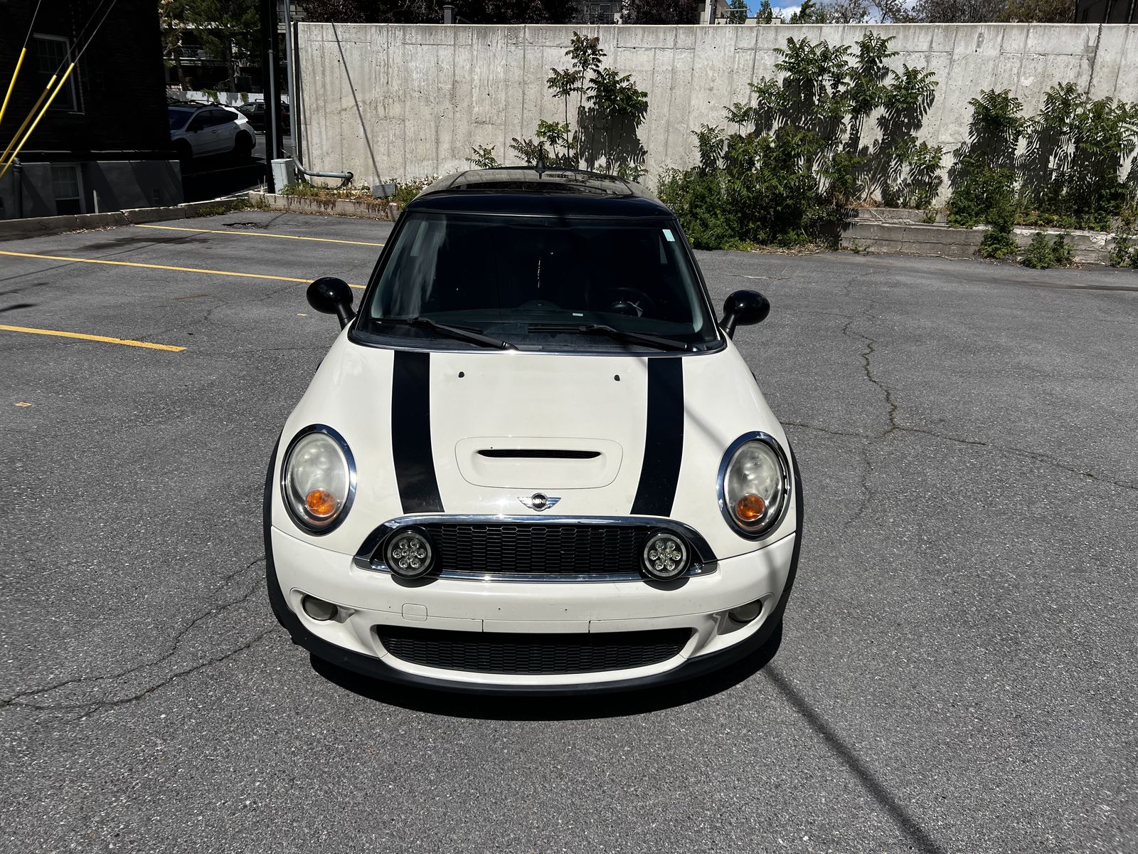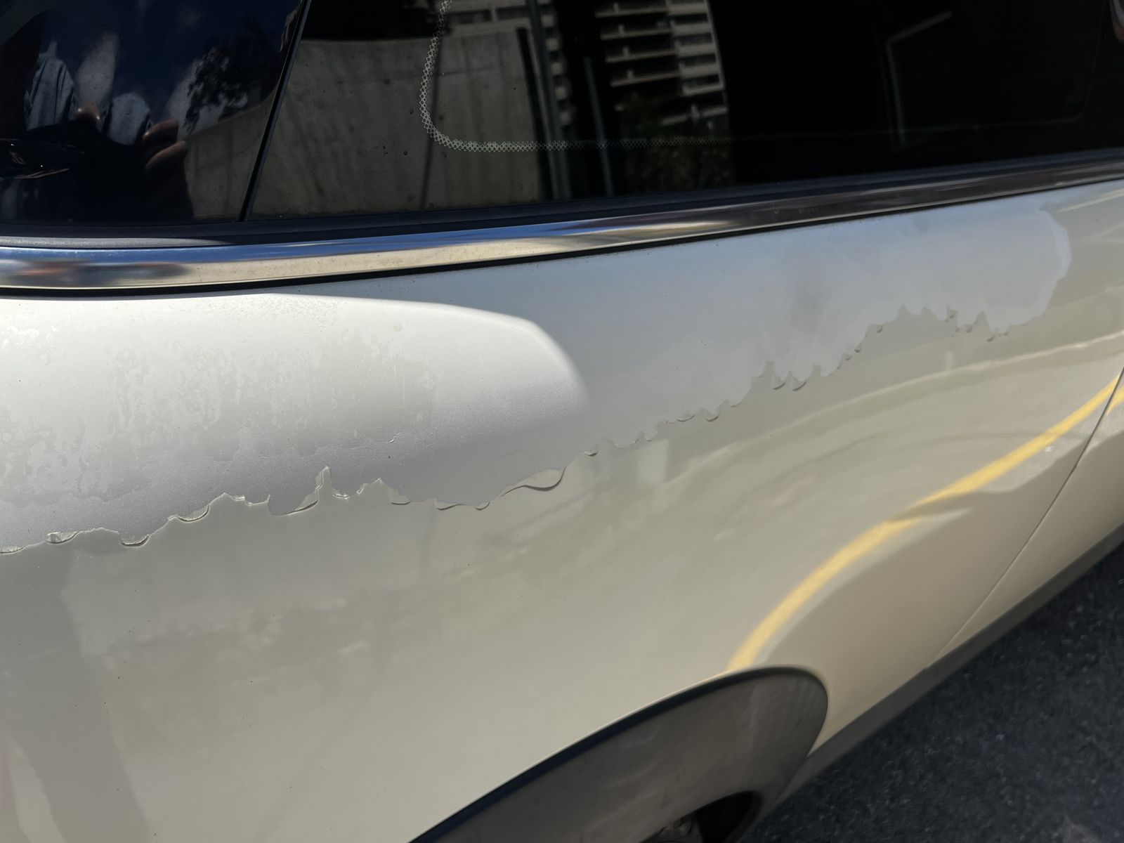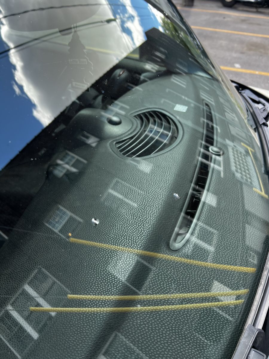 Has a couple small chips in the windshield (pictured) and some paint fading on the back passenger side (also pictured).