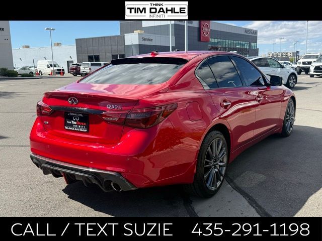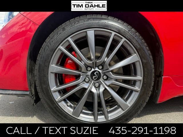 The 2023 INFINITI Q50 Red Sport 400 Certified Pre-Owned is a high-performance luxury sedan that blends twin-turbo power, sharp styling, and added peace of mind through INFINITIs CPO program. Its powered by a 3.0-liter twin-turbo V6 producing 400 horsepower and 350 lb-ft of torque, paired with a 7-speed automatic transmission and available rear-wheel or all-wheel drive. This setup delivers quick acceleration (around 060 mph in the mid-4 second range) and a strong, responsive driving experience while still averaging about 22 MPG combined.