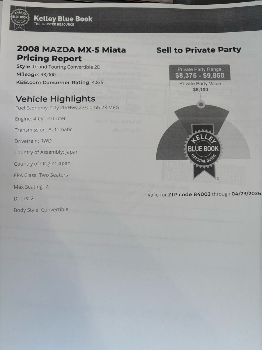 Excellent condition Miata with crazy low miles. Runs and drives great, no problems at all! Brand new tires. A/C blows cold. Automatic transmission. Everything works great. Just passed safety and emissions Message with questions or to come by and see it. It’s at our shop in American Fork. Please don’t send “is this available” message. If it’s listed, it’s available. Laurel 801-362-9090. DLR, plus tax and registration.