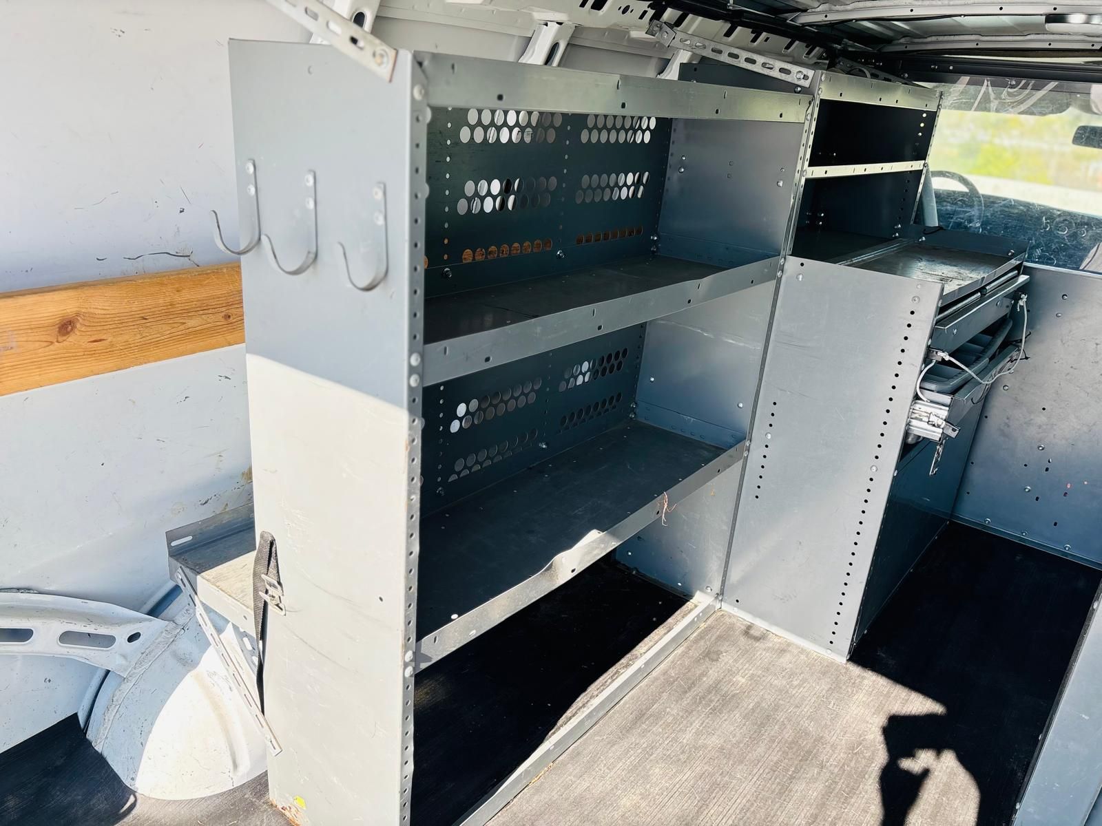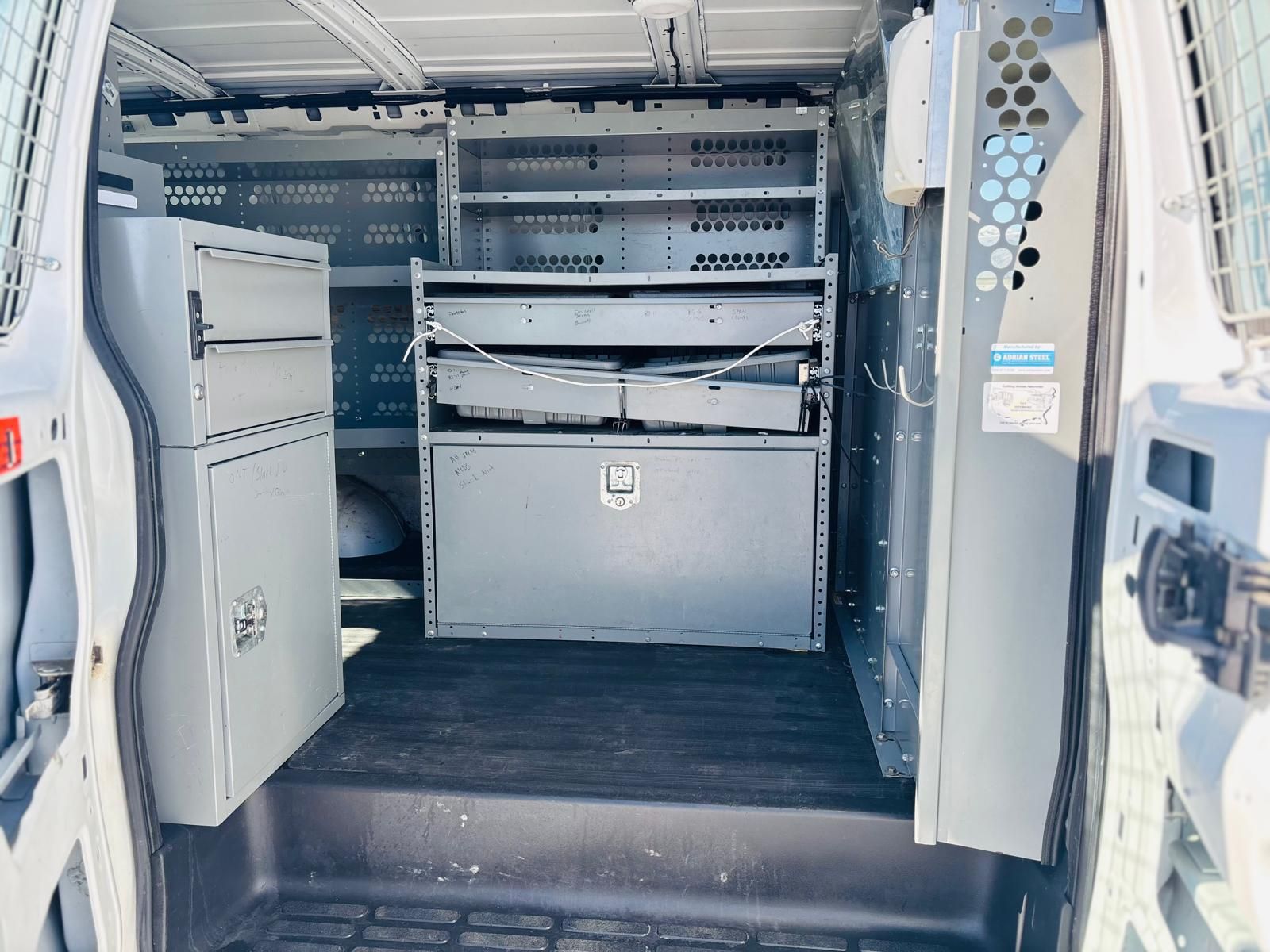 Spacious cargo area withinstalled shelving systemto keep tools and supplies organized.