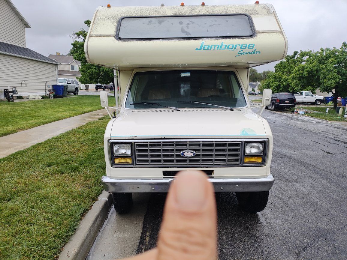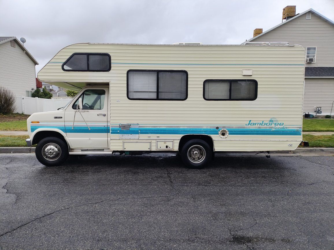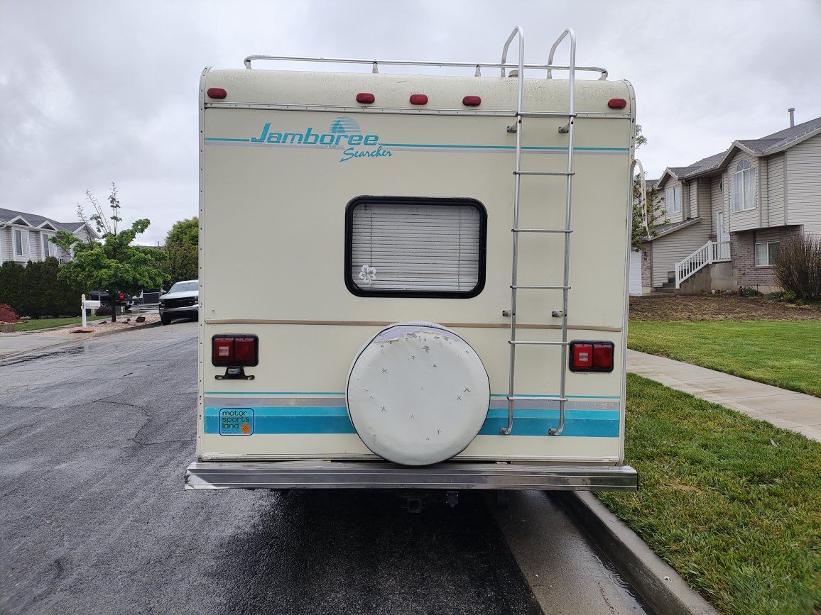 1991 class c motorhome Fleetwood jamboree searcher 21 ft sleeps 4 overhead cab sleeps too dinette sleeps one sofa sleeps one has roof AC heat refrigerator microwave stove and oven stand up shower very clean never smoked in never lived in and pet free interiors and excellent shape has owned in 4000 w generator needs carburetor work starts but shuts off after a few seconds tires are good engine runs great transmission is good no slipping no hard shifting has tow package actual miles is 81,000 clear Utah title and hand asking $5,700 in best offer no payments no trades