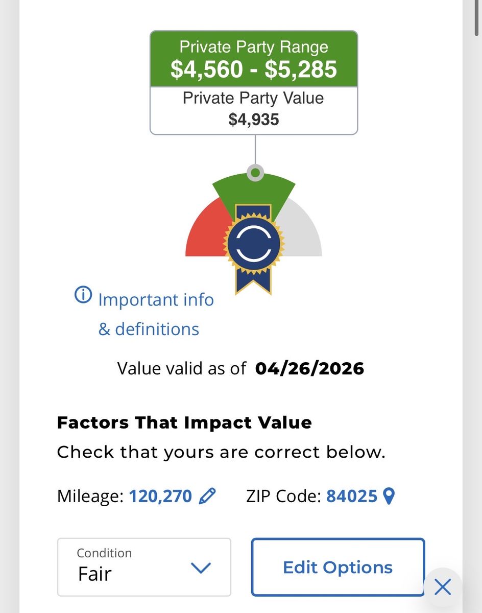 Kelley Blue Book value is estimated between $4,560–$5,285, so we’re pricing it fairly for a quick, smooth sale.