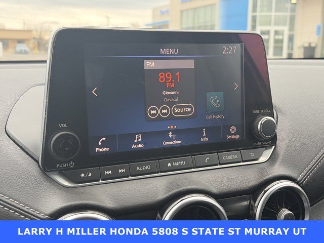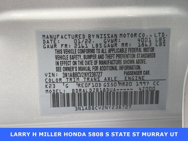 CVT with Xtronic, Black Cloth.Priced below KBB Fair Purchase Price!Larry H. Miller Honda Murray offers this 2022 Brilliant Silver Metallic Nissan Sentra SV FWD It is loaded with many standard and optional features including: CVT with Xtronic, Black Cloth, 16 Alloy Wheels, 4-Wheel Disc Brakes, 6 Speakers, ABS brakes, Air Conditioning, Alloy wheels, AM/FM radio: SiriusXM, Auto High-beam Headlights, Blind Spot Warning, Body Colored Splash Guards (4-Piece), Brake assist, Bumpers: body-color, Carpeted Floor Mats w/Trunk Mat, Clear Rear Bumper Protector, Delay-off headlights, Door Sill Plates, Driver door bin, Driver vanity mirror, Dual front impact airbags, Dual front side impact airbags, Electronic Stability Control, Four wheel independent suspension, Front anti-roll bar, Front Bucket Seats, Front Center Armrest, Front reading lights, Fully automatic headlights, Heated door mirrors, Illuminated entry, Knee airbag, Low tire pressure warning, NissanConnect featuring Apple CarPlay and Android Auto, Occupant sensing airbag, Outside temperature display, Overhead airbag, Overhead console, Panic alarm, Passenger door bin, Passenger vanity mirror, Power door mirrors, Power steering, Power windows, Premium Cloth Seat Trim, Radio data system, Radio: AM/FM w/RDS/MP3/Aux-In, Rear anti-roll bar, Rear Parking Sensors, Rear seat center armrest, Rear side impact airbag, Rear window defroster, Remote keyless entry, Security system, Speed control, Speed-sensing steering, Split folding rear seat, Steering wheel mounted audio controls, Tachometer, Telescoping steering wheel, Tilt steering wheel, Traction control, Trip computer, and Variably intermittent wipers.