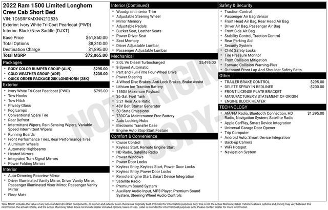 2022 Ram 1500 Laramie Longhorn Ivory White Tri-Coat Pearlcoat 4WD 8-Speed Automatic EcoDiesel 3.0L V6 21/29 City/Highway MPG