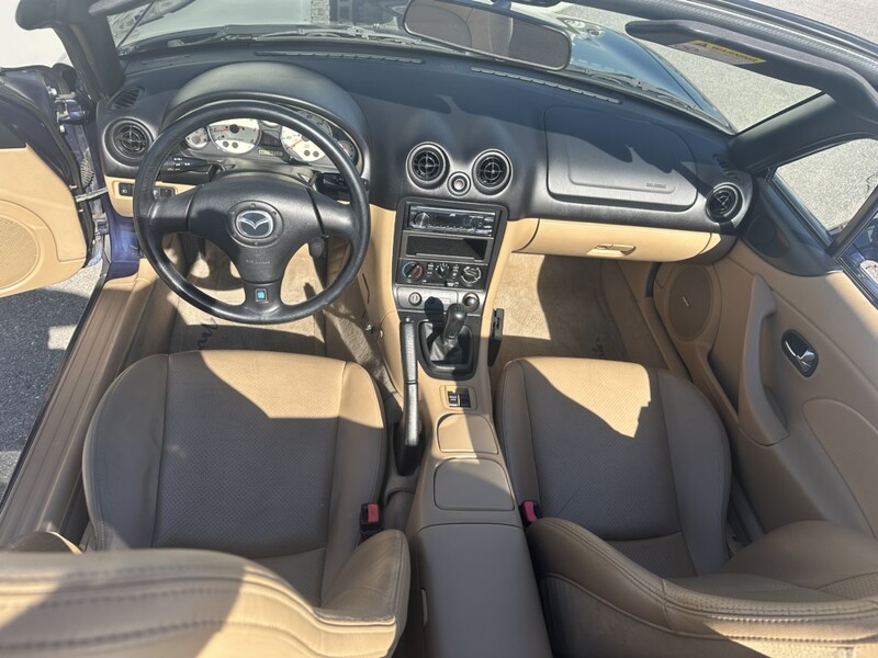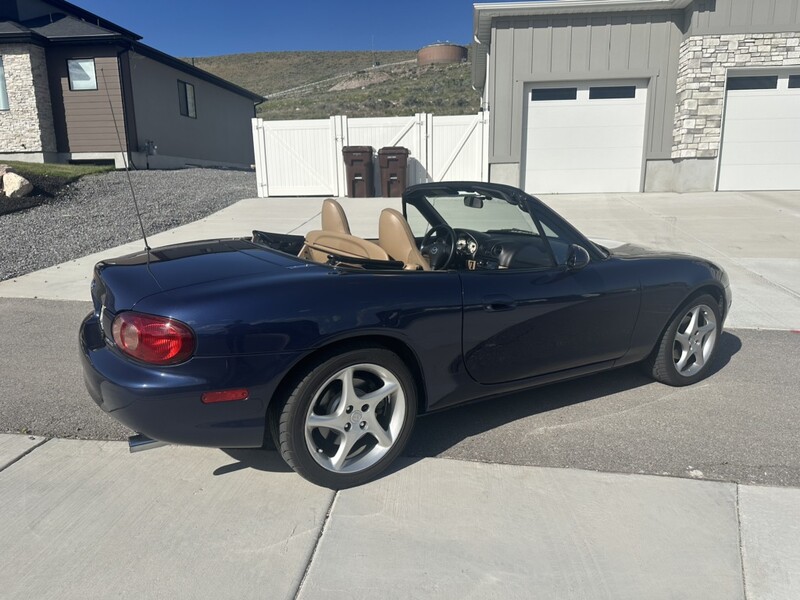 This is a 2001 Miata in Midnight Blue Mica. It has a 6 speed manual transmission and 1.8L naturally aspirated engine