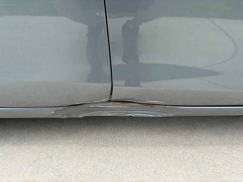 It’s got a scraped bottom panel and a missing hubcap on the passenger side due to a particularly stealthy piece of concrete on 820 N in Provo. Doesn’t impact the frame or useability. Does add sex appeal.