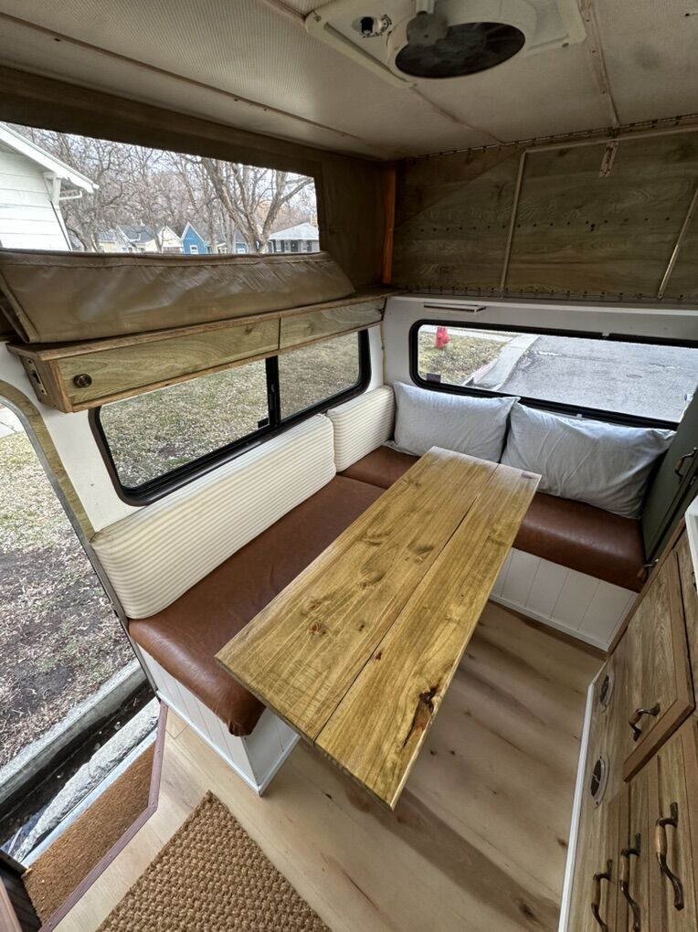 The pop top drops the roof two feet when driving for less wind resistance, and low clearance. With the top down the van is only 7 feet tall and 17’ long from bumper to bumper. Easily fits a family of four. There is a double bed over the cab and the table converts to a bed for two smaller people.