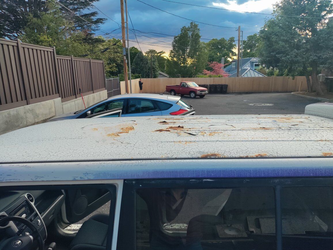 There is some paint damage on the car, but there's a funny story behind that. This used to be the car of a radio station and they wrapped it in purple. Them or the next owner apparently didn't know how to properly remove a car wrap. But besides that, there is not really rust on the rest of the car. The radio station also put a sub in it, if case you like a strong bass.