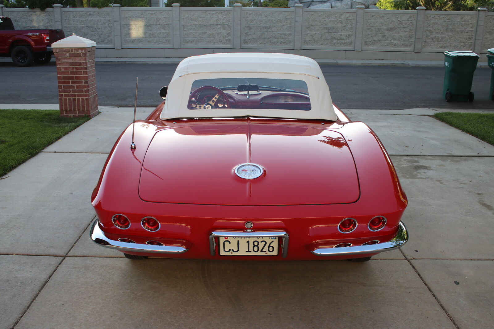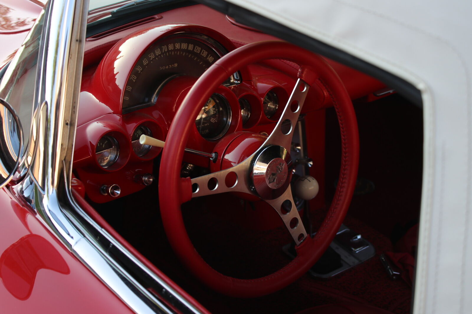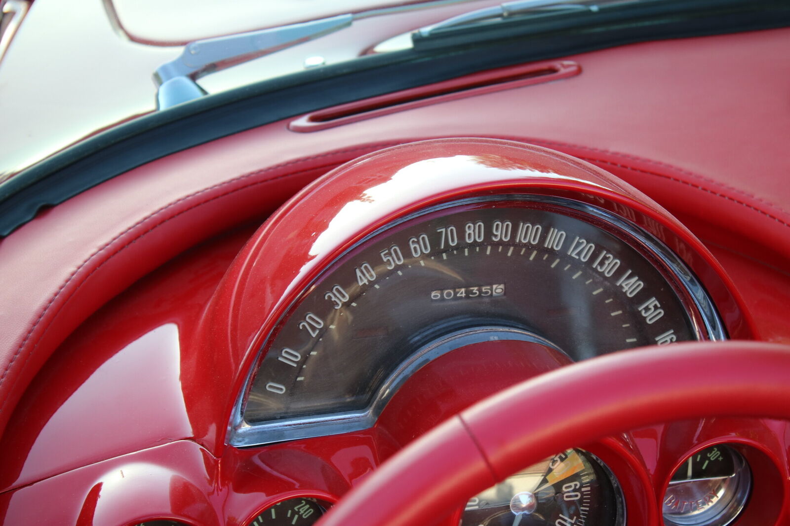 Red vinyl bucket seats, wraparound windshield, chrome trim