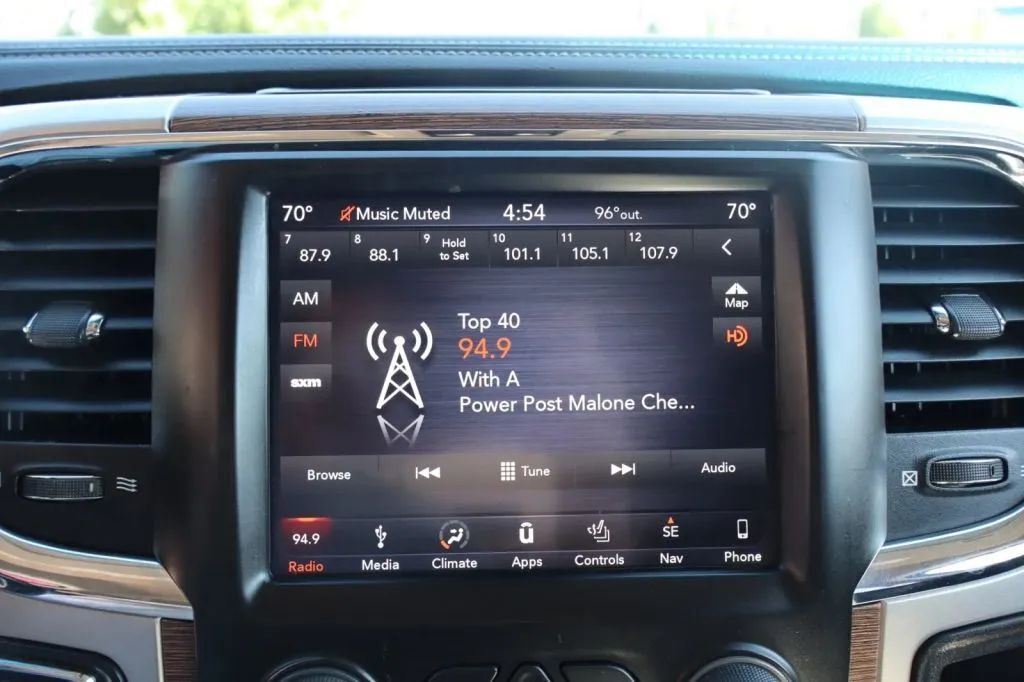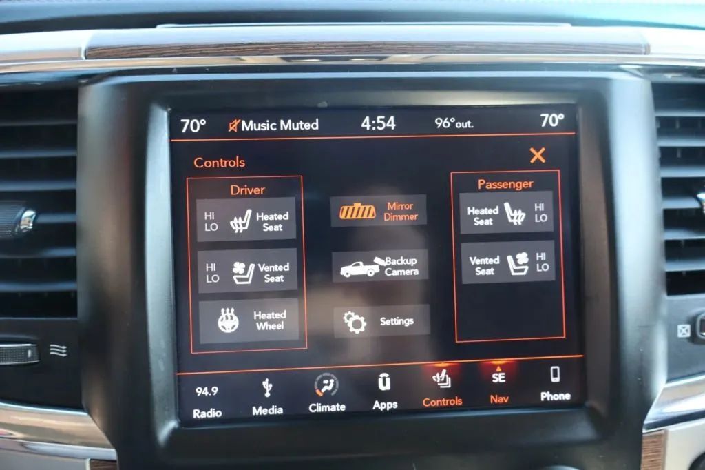 Leather-trimmed Upholstery, Proximity Entry System Multi-function remote, Ventilated Driver seat, Ventilated Passenger seat, Heated steering wheel, 10 Driver seat power adjustments, Leather Steering wheel trim, Automatic Climate Control Front air conditioning, Driver Seat Memorized settings, Side Mirrors Memorized settings, Dual Front air conditioning zones, Adjustable Pedals Memorized settings, Power Adjustable pedals, Heated Driver seat, Heated Passenger seat, Garage Door Opener Universal remote transmitter, Auto-dimming Rearview mirror, Cruise control, 6 Passenger seat power adjustments, Ambient lighting, Chrome Shift knob trim, Keyless Entry Multi-function remote, 60-40 Split Bench Rear seat, Simulated Wood Dash trim, Simulated Wood Door trim, 40-20-40 Split Bench Front seat, 115V Front Power outlet(s), Carpet Floor mat material, 2 Driver Memorized settings, Air filtration, Customizable instrument cluster, 7 In. Instrument cluster screen size, Folds Up Rear seat folding, 12V Front Power outlet(s), Rear Center Folding With Storage Armrests, Rear Floor mats, Front Floor mats, Multi-function display, Rubber/vinyl Cargo area floor mat, Power steering, Compass, External temperature display, MPG Fuel economy display, Range Fuel economy display, Tilt Steering wheel, Front Reading lights, Tachometer Gauge, Rear Reading lights, Lumbar Driver seat power adjustments, Lumbar Passenger seat power adjustments, Reclining Passenger seat power adjustments, Reclining Driver seat power adjustments, Height Driver seat power adjustments, Front Cupholders, Maintenance Due Warnings and reminders, Front Overhead console, Dual Illuminating Vanity mirrors, Rear Cupholders, 2 One-touch windows, Panic Alarm Multi-function remote, Audio Steering wheel mounted controls, Under Rear Seats Storage, Carpet Floor material, Cruise Control Steering wheel mounted controls, Phone Steering wheel mounted controls, Multi-function Steering wheel mounted controls, Front Seatback Storage, Voice Control Steering wheel mounted controls, In Seat Cushion Storage, Powertrain hour meter, Front Center Armrests, Audio System Memorized settings, Alpine Premium brand, Apple CarPlay Smartphone integration, Android Auto Smartphone integration, Bluetooth Wireless data link, Voice Operated Hands-free phone call integration, Voice Operated Radio, Bluetooth Auxiliary audio input, Surround sound, HD Radio Radio, 8.4 In. Infotainment screen size, 8 Total speakers, Touch Screen Display Radio, 1 Subwoofer, App Marketplace Integration Connected in-car apps, With Read Function Electronic messaging assistance, Voice Operated Electronic messaging assistance, SiriusXM Satellite radio, USB Auxiliary audio input, IPod/iPhone Auxiliary audio input, Uconnect Infotainment, Vehicle Location Smart device app function, Lock Operation Smart device app function, Horn/light Operation Smart device app function, Jack Auxiliary audio input, Memory Card Slot Auxiliary audio input, Roadside Assistance Driver assistance app, AM/FM Radio, Radio data system, Speed sensitive volume control, Google POIs Connected in-car apps, Google Search Connected in-car apps, Trailer brake controller, Class IV Trailer hitch, Electronic Hi-lo 4WD selector, Part Time W/ On Demand Setting 4WD, 4-pin Trailer wiring, 7-pin Trailer wiring, Auxiliary oil cooler, 730 CCA Battery rating, Independent Front suspension classification, Multi-link Rear suspension, Front struts, Short And Long Arm Front suspension, Auxiliary transmission fluid cooler, 160 Amps Alternator, Solid Live Axle Rear suspension classification, Front stabilizer bar, Rear stabilizer bar, Battery saver, Twin-tube Gas Rear shock, Twin-tube Gas Front shock, Rearview Camera system, Front Side airbags, Rear Side curtain airbags, Front Side curtain airbags, 4-wheel ABS, Anti-lockout Power door locks, Auto-locking Power door locks, Brake drying, Trailer stability control, Ventilated Disc Rear brake, Alarm Anti-theft system, Braking assist, Hill holder control, Ventilated Disc Front brake, Dual Front airbags, Vehicle Immobilizer Anti-theft system, Power brakes, LATCH System Child seat anchors, Electronic brakeforce distribution, Stability control, Traction control, In Dash Rearview monitor, Occupant Sensing Passenger Airbag deactivation, Front Seatbelt pretensioners, Front Seatbelt force limiters, Front Emergency locking retractors, Rear Emergency locking retractors, Roll stability control, Front Seatbelt warning sensor, Auto-dimming Side mirrors, LED Daytime running lights, LED Taillights, Power Folding Side mirror adjustments, Chrome Clad Wheels, Power Horizontal Pickup sliding rear window, Safety Reverse Power windows, Power Locking Tailgate, Chrome Mirror color, Power Side mirror adjustments, Heated Side mirrors, Front fog lights, Chrome Door handle color, Puddle Lamps Exterior entry lights, Chrome Front bumper color, Steel Spare wheel, Variable Intermittent Front wipers, Rear privacy glass, Tire Pressure Monitoring System, Integrated Turn Signals Side mirrors, Active grille shutters, Reverse Gear Tilt Side mirror adjustments, Solar-tinted glass, Full-size Spare tire size, Auto On/off Headlights, Auto Delay Off Headlights, Chrome Rear bumper color, Pickup bed light, Chrome Grille color, Chrome Surround Grille color, Black Window trim